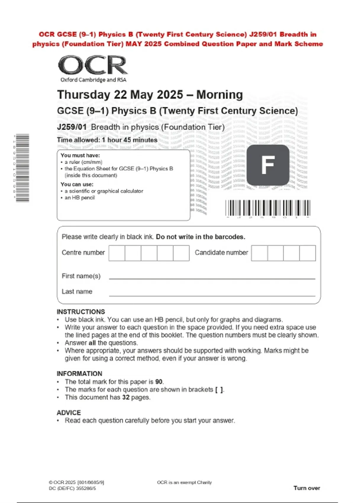 OCR GCSE (9–1) Physics B (Twenty First Century Science) J259/01 Breadth in physics (Foundation Tier) MAY 2025 Combined Question Paper and Mark Scheme
