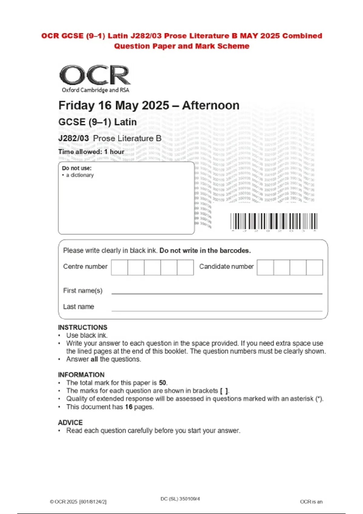OCR GCSE (9–1) Latin J282/03 Prose Literature B MAY 2025 Combined Question Paper and Mark Scheme