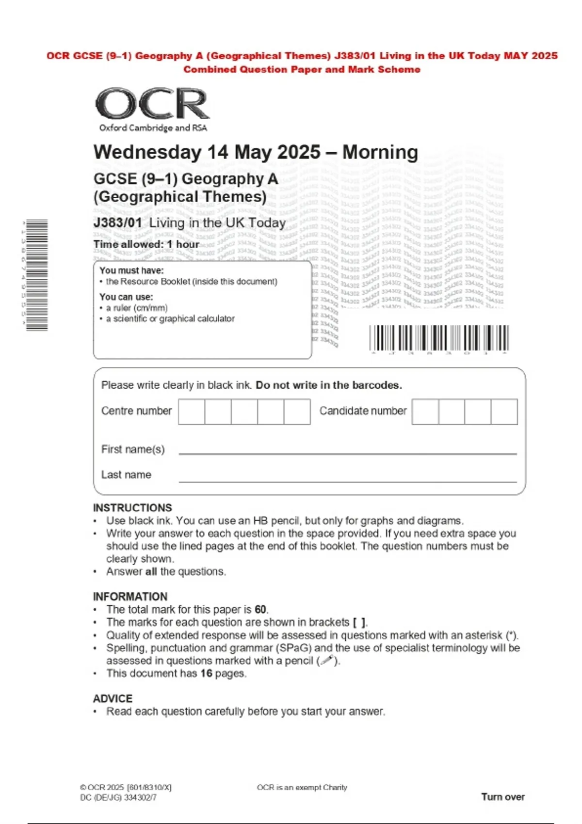 OCR GCSE (9–1) Geography A (Geographical Themes) J383/01 Living in the UK Today MAY 2025 Combined Question Paper and Mark Scheme