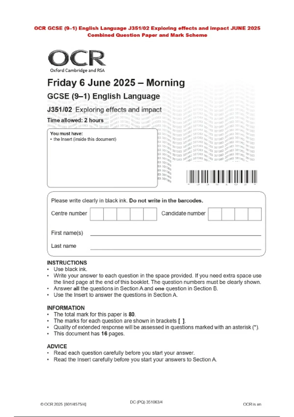OCR GCSE (9–1) English Language J351/02 Exploring effects and impact JUNE 2025 Combined Question Paper and Mark Scheme