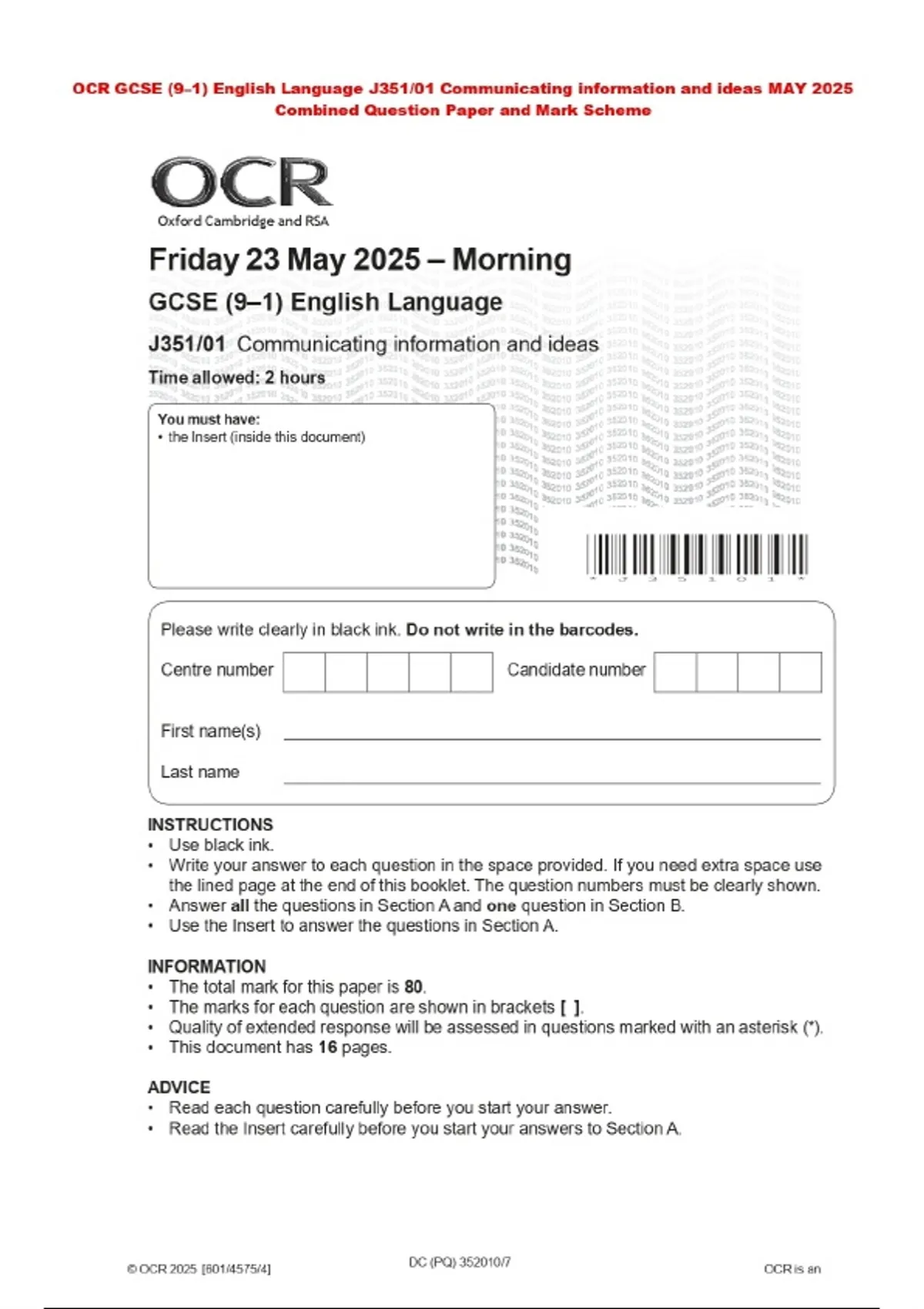 OCR GCSE (9–1) English Language J351/01 Communicating information and ideas MAY 2025 Combined Question Paper and Mark Scheme