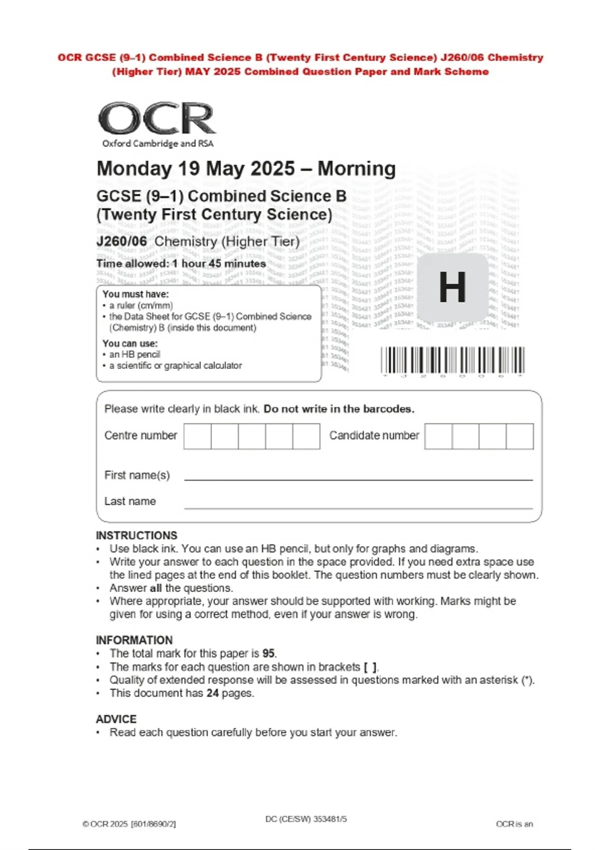 OCR GCSE (9–1) Combined Science B (Twenty First Century Science) J260/06 Chemistry (Higher Tier) MAY 2025 Combined Question Paper and Mark Scheme