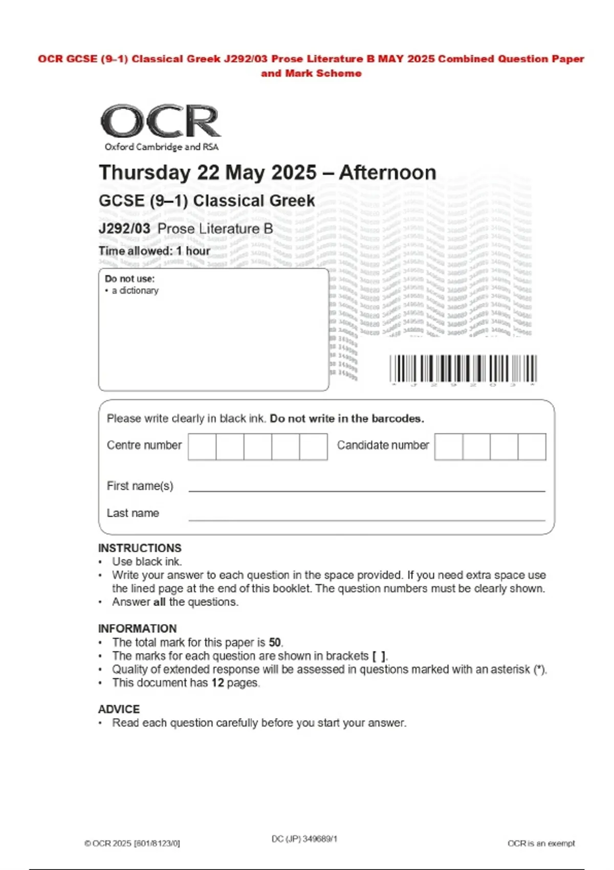 OCR GCSE (9–1) Classical Greek J292/03 Prose Literature B MAY 2025 Combined Question Paper and Mark Scheme
