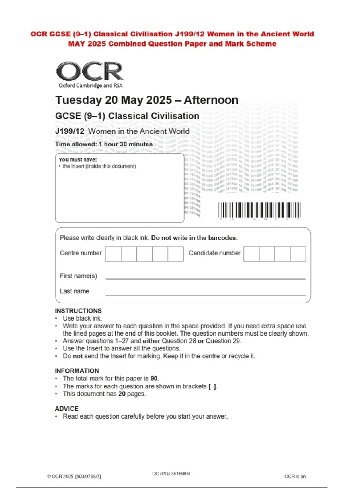 OCR GCSE (9–1) Classical Civilisation J199/12 Women in the Ancient World MAY 2025 Combined Question Paper and Mark Scheme