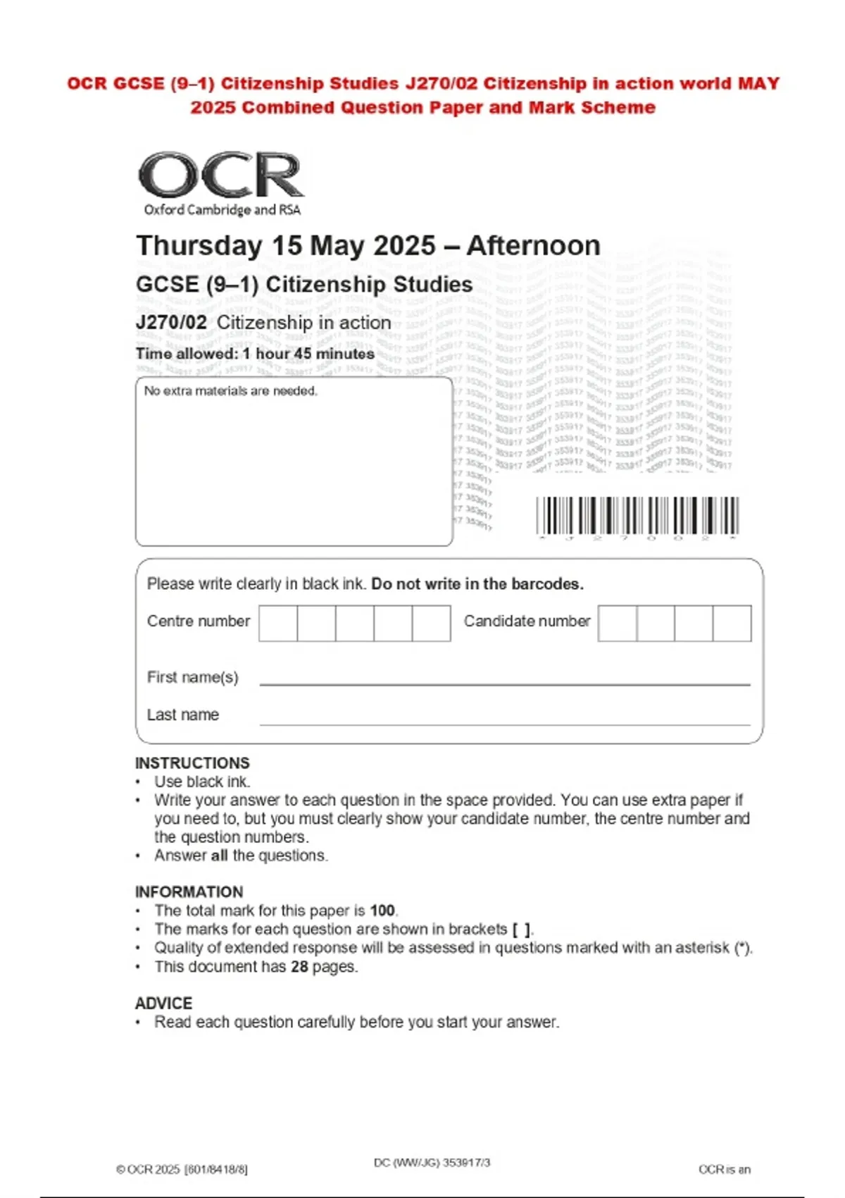 OCR GCSE (9–1) Citizenship Studies J270/02 Citizenship in action world MAY 2025 Combined Question Paper and Mark Scheme