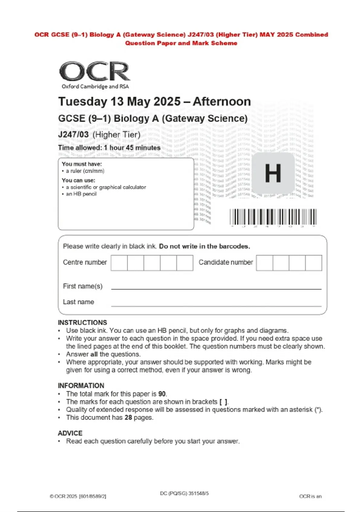 OCR GCSE (9–1) Biology A (Gateway Science) J247/03 (Higher Tier) MAY 2025 Combined Question Paper and Mark Scheme