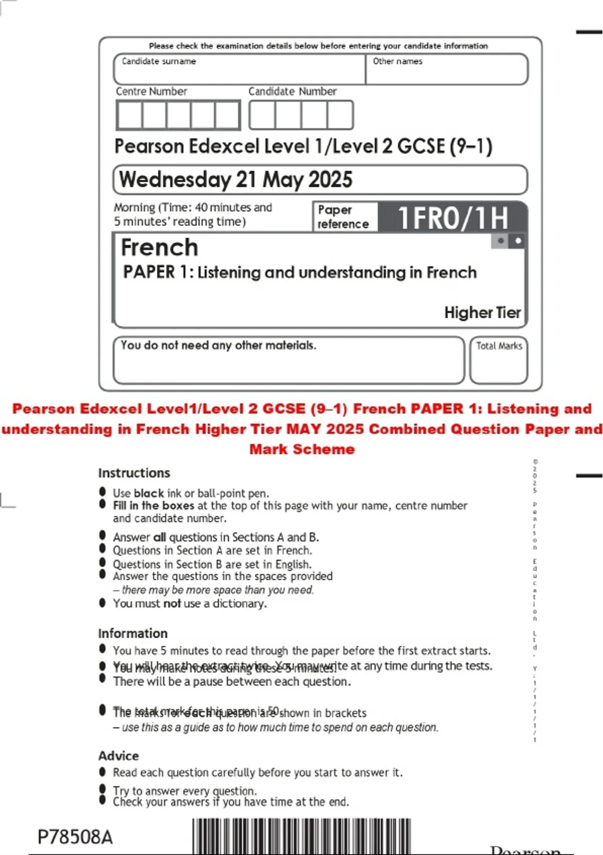 Pearson Edexcel Level1/Level 2 GCSE (9–1) French PAPER 1: Listening and understanding in French Higher Tier MAY 2025 Combined Question Paper and Mark Scheme