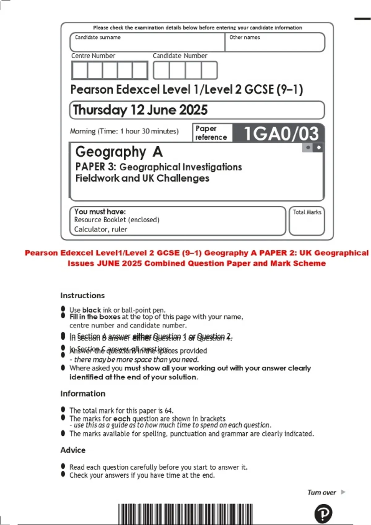 BUNDLE:::Pearson Edexcel Level 1/Level 2 GCSE (9–1) Geography 2025 Combined Question Paper and Mark Scheme