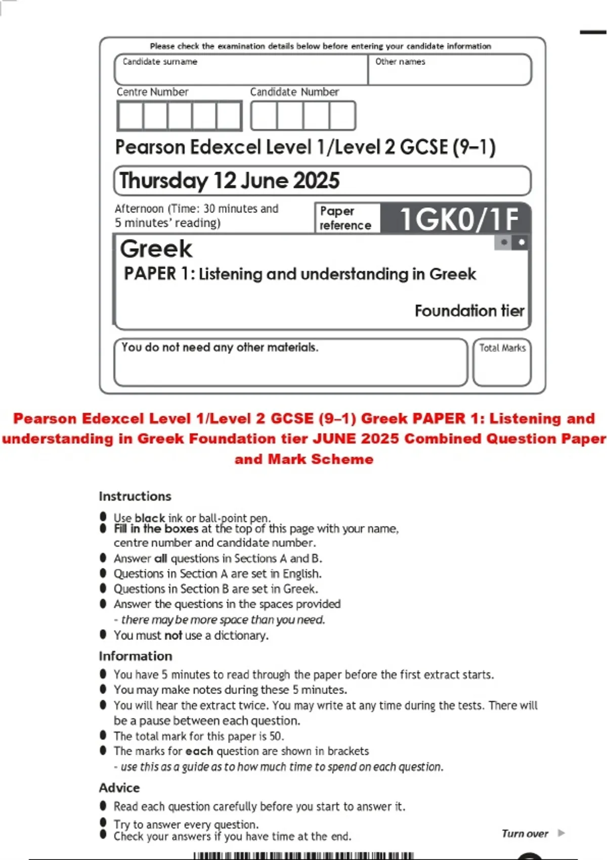 Pearson Edexcel Level 1/Level 2 GCSE (9–1) Greek PAPER 1: Listening and understanding in Greek Foundation tier JUNE 2025 Combined Question Paper and Mark Scheme
