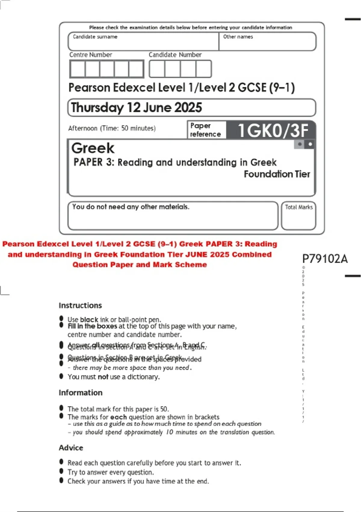 Pearson Edexcel Level 1/Level 2 GCSE (9–1) Greek PAPER 3: Reading and understanding in Greek Foundation Tier JUNE 2025 Combined Question Paper and Mark Scheme