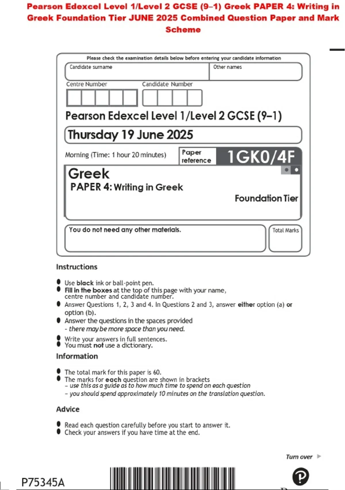 Pearson Edexcel Level 1/Level 2 GCSE (9–1) Greek PAPER 4: Writing in Greek Foundation Tier JUNE 2025 Combined Question Paper and Mark Scheme