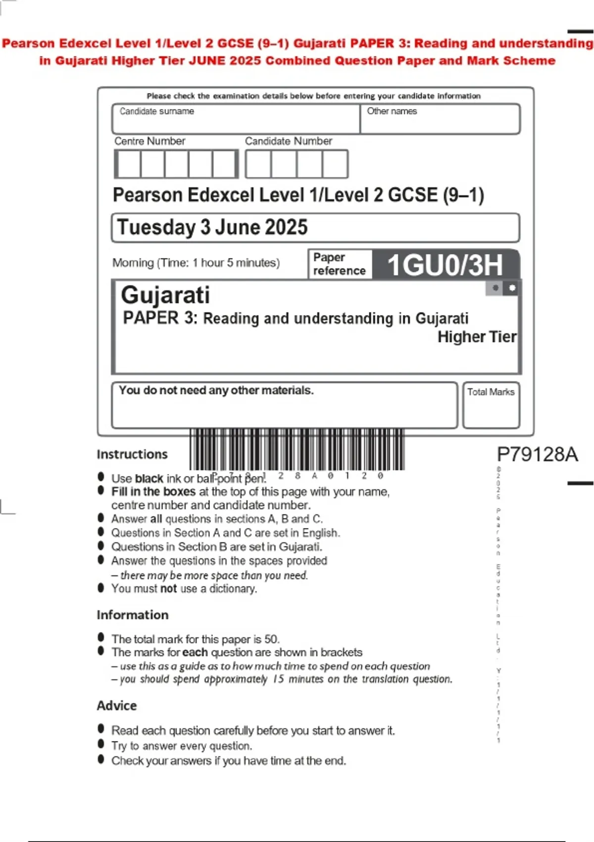 Pearson Edexcel Level 1/Level 2 GCSE (9–1) Gujarati PAPER 3: Reading and understanding in Gujarati Higher Tier JUNE 2025 Combined Question Paper and Mark Scheme