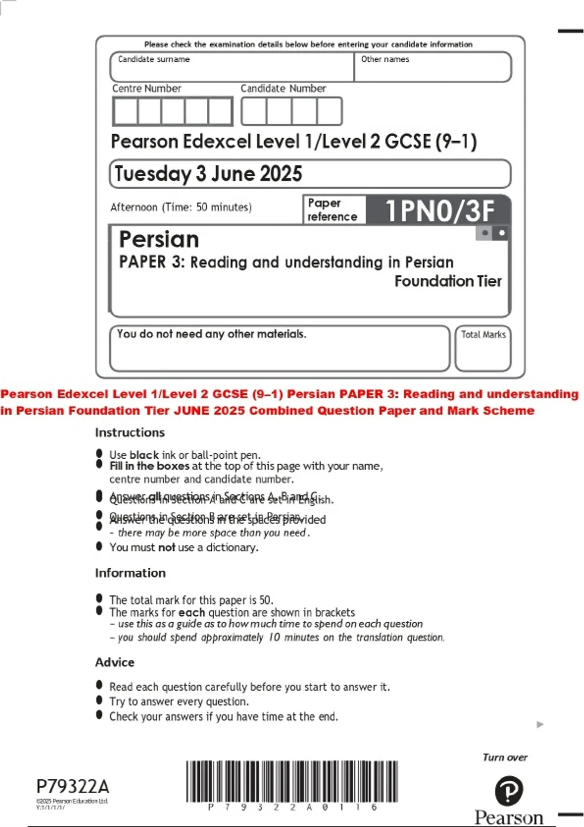 BUNDLE:::Pearson Edexcel Level 1/Level 2 GCSE (9–1) Persian 2025 Combined Question Paper and Mark Scheme