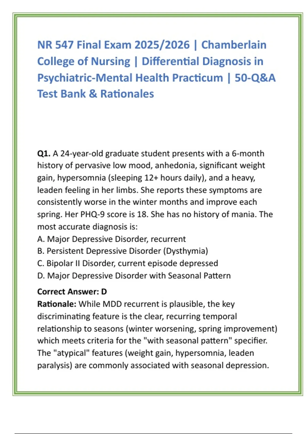 Psychiatric-Mental Health Practicum | 50-Q&A