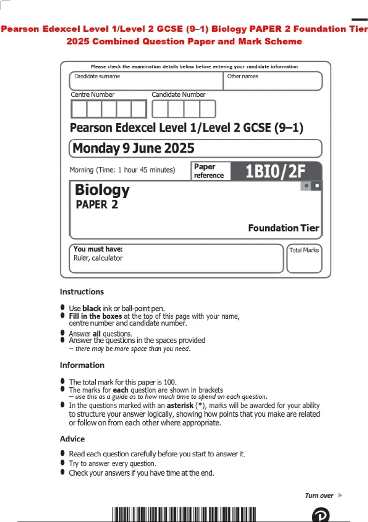 Pearson Edexcel Level 1/Level 2 GCSE (9–1) Biology PAPER 2 Foundation Tier 2025 Combined Question Paper and Mark Scheme