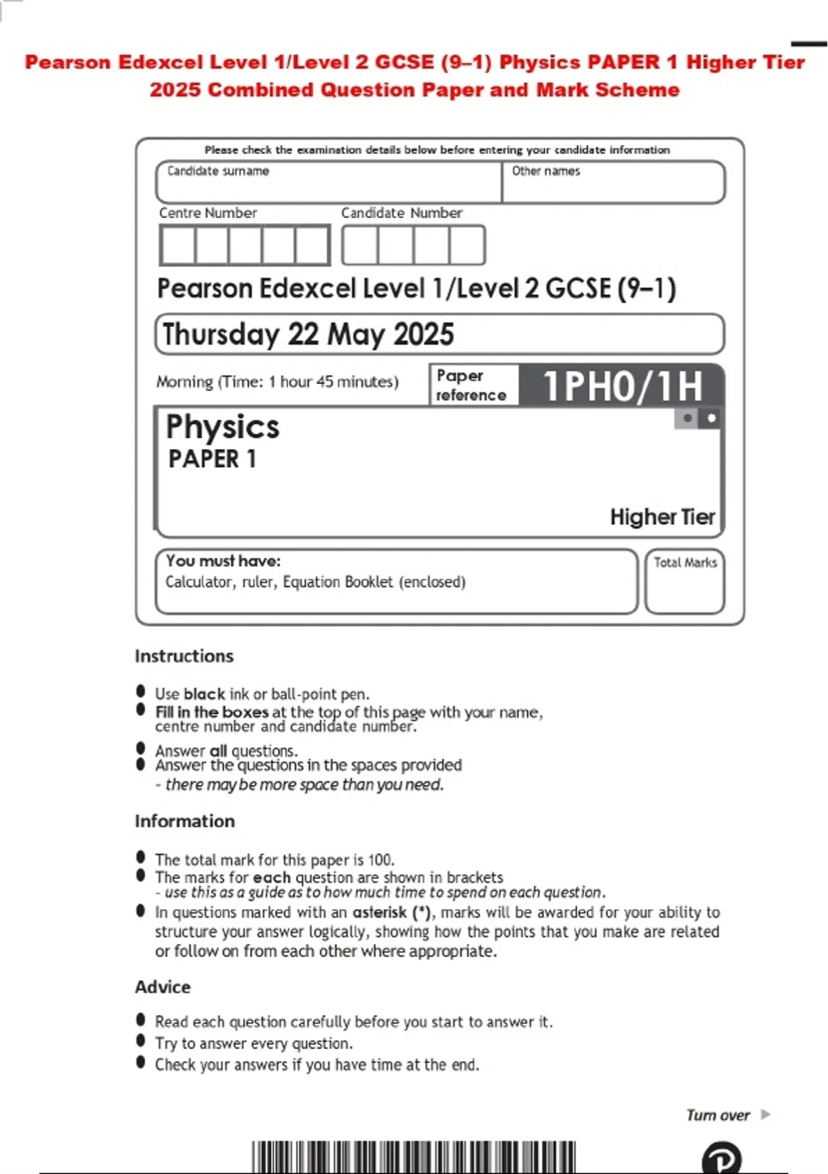 Pearson Edexcel Level 1/Level 2 GCSE (9–1) Physics PAPER 1 Higher Tier 2025 Combined Question Paper and Mark Scheme