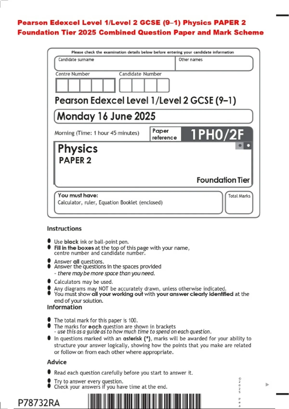Pearson Edexcel Level 1/Level 2 GCSE (9–1) Physics PAPER 2 Foundation Tier 2025 Combined Question Paper and Mark Scheme