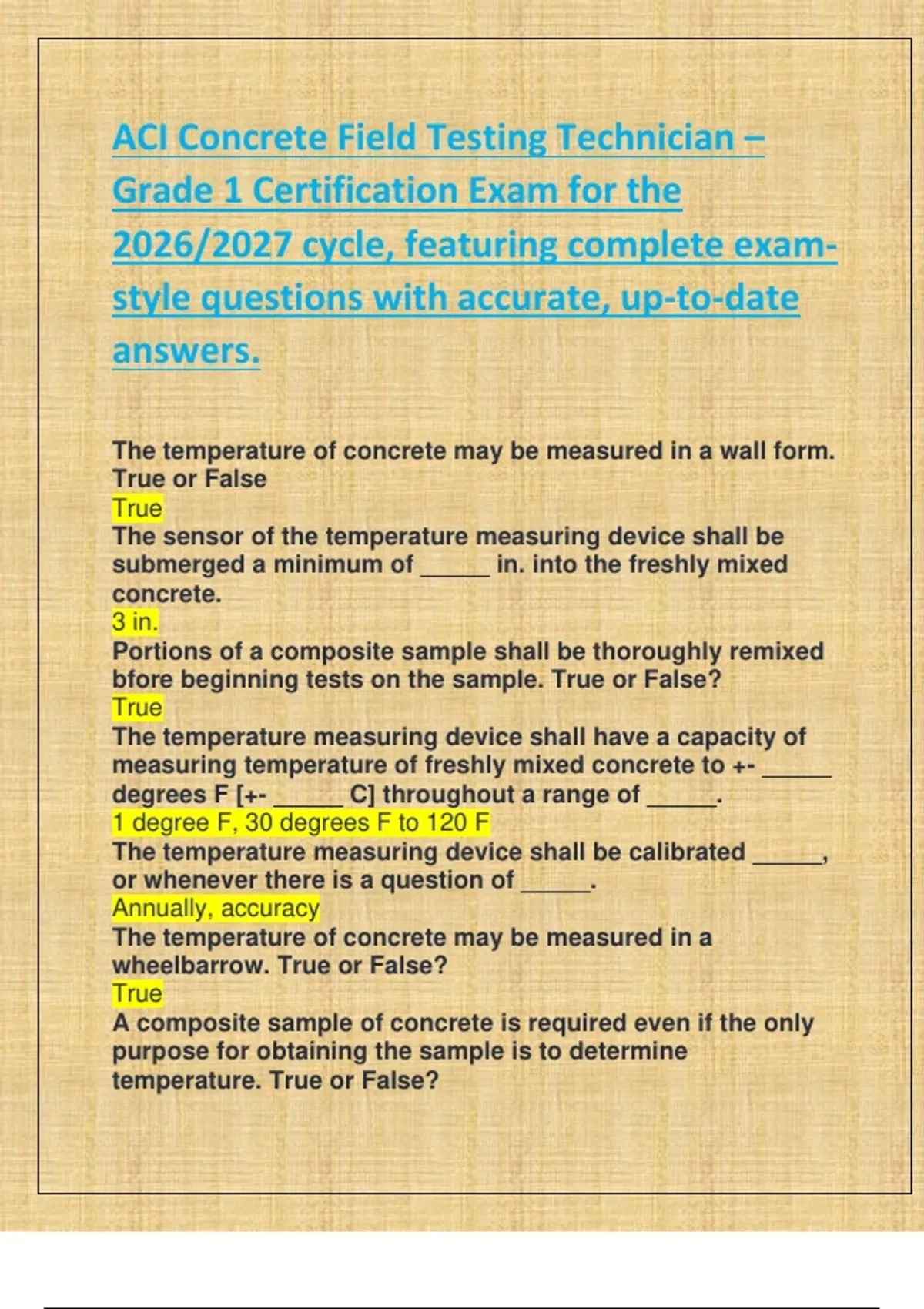 ACI Concrete Field Testing Technician – Grade 1 Certification Exam for the 2026/2027 cycle, featuring complete exam style questions with accurate, up-to-date answers.