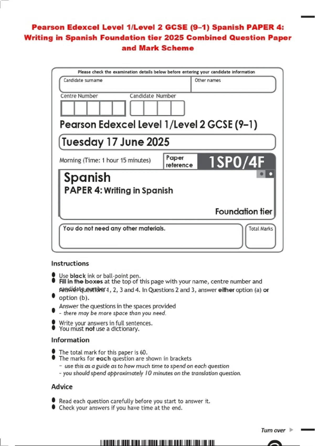 Pearson Edexcel Level 1/Level 2 GCSE (9–1) Spanish PAPER 4: Writing in Spanish Foundation tier 2025 Combined Question Paper and Mark Scheme