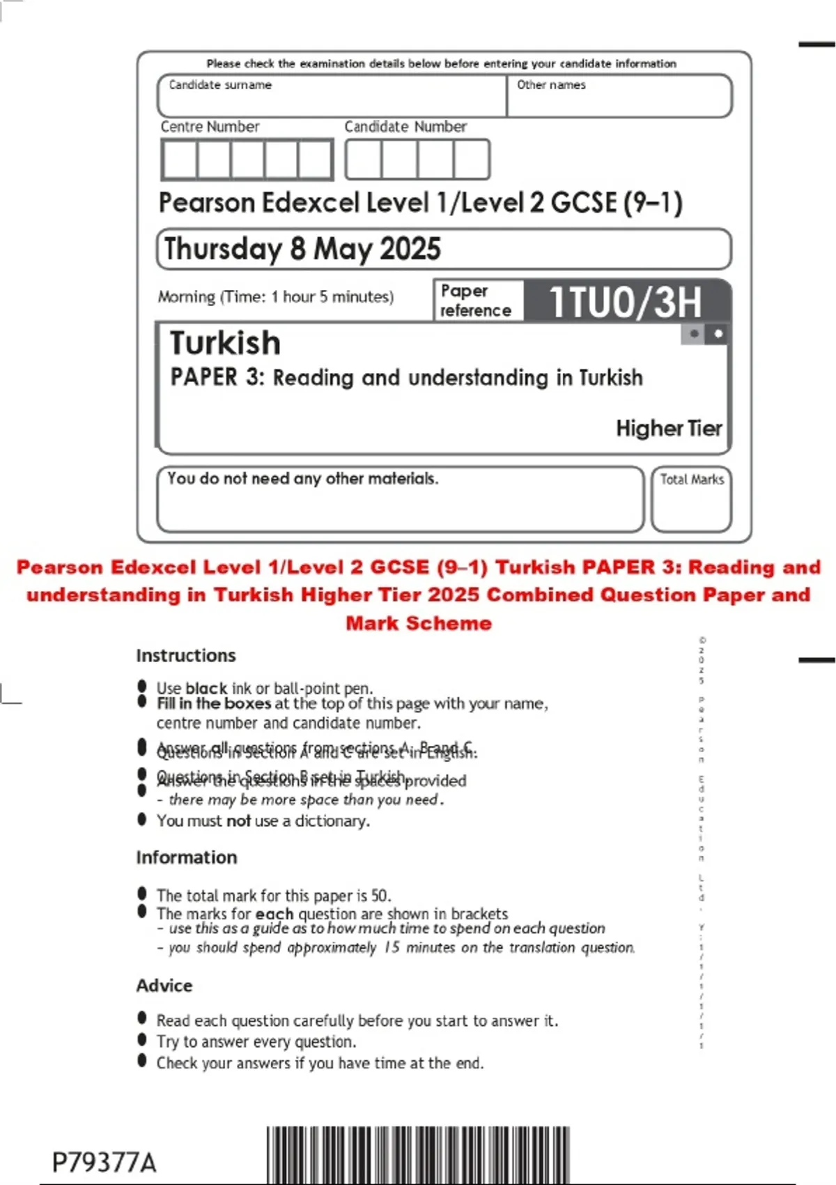 Pearson Edexcel Level 1/Level 2 GCSE (9–1) Turkish PAPER 3: Reading and understanding in Turkish Higher Tier 2025 Combined Question Paper and Mark Scheme