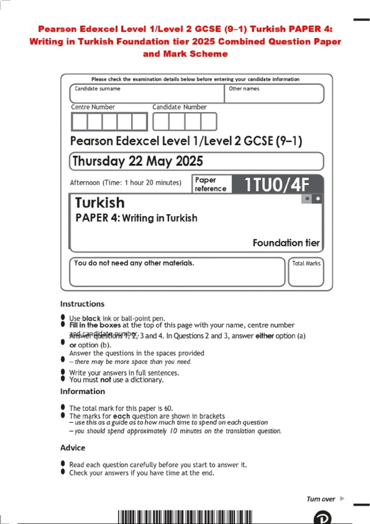 Pearson Edexcel Level 1/Level 2 GCSE (9–1) Turkish PAPER 4: Writing in Turkish Foundation tier 2025 Combined Question Paper and Mark Scheme