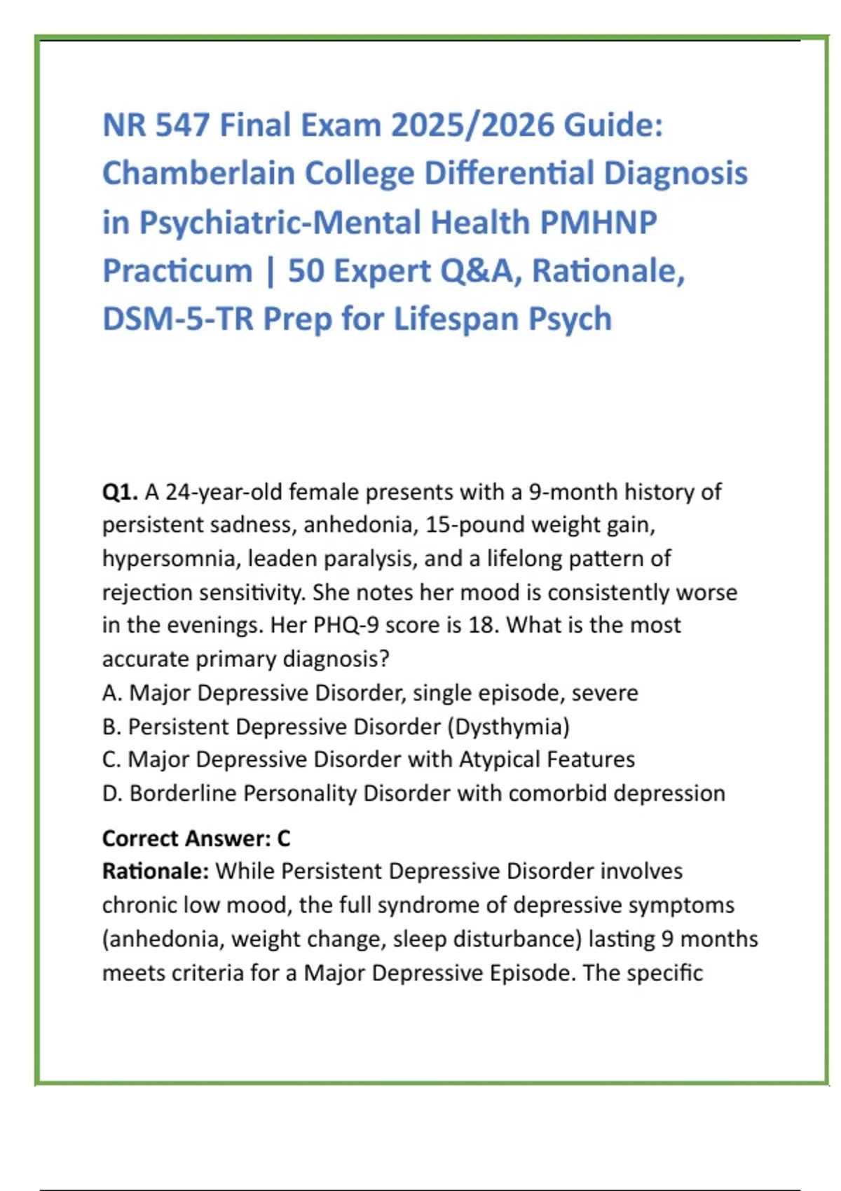 consideration. D: Persistent Depressive Disorder (dysthymia)