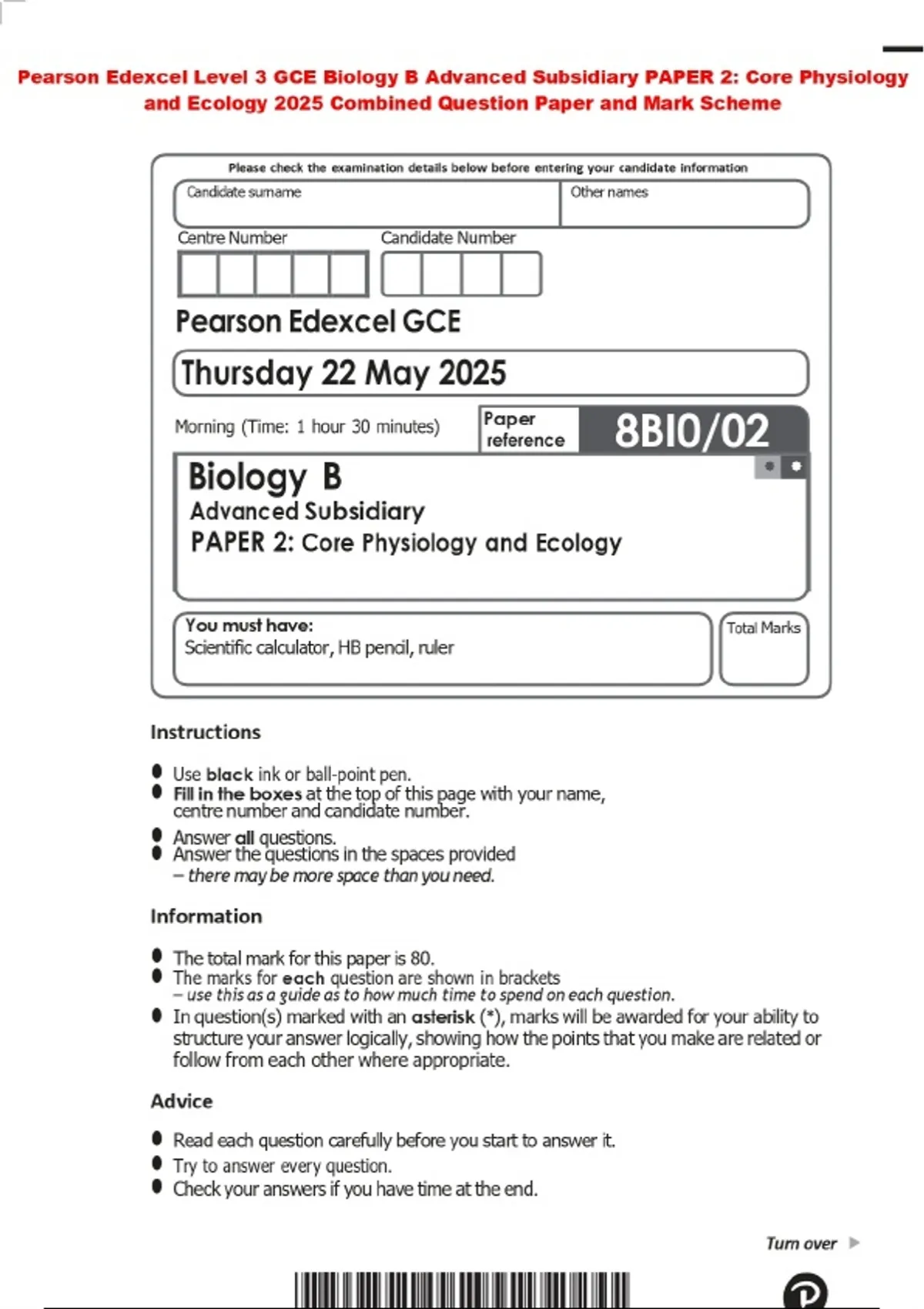 Pearson Edexcel Level 3 GCE Biology B Advanced Subsidiary PAPER 2: Core Physiology and Ecology 2025 Combined Question Paper and Mark Scheme