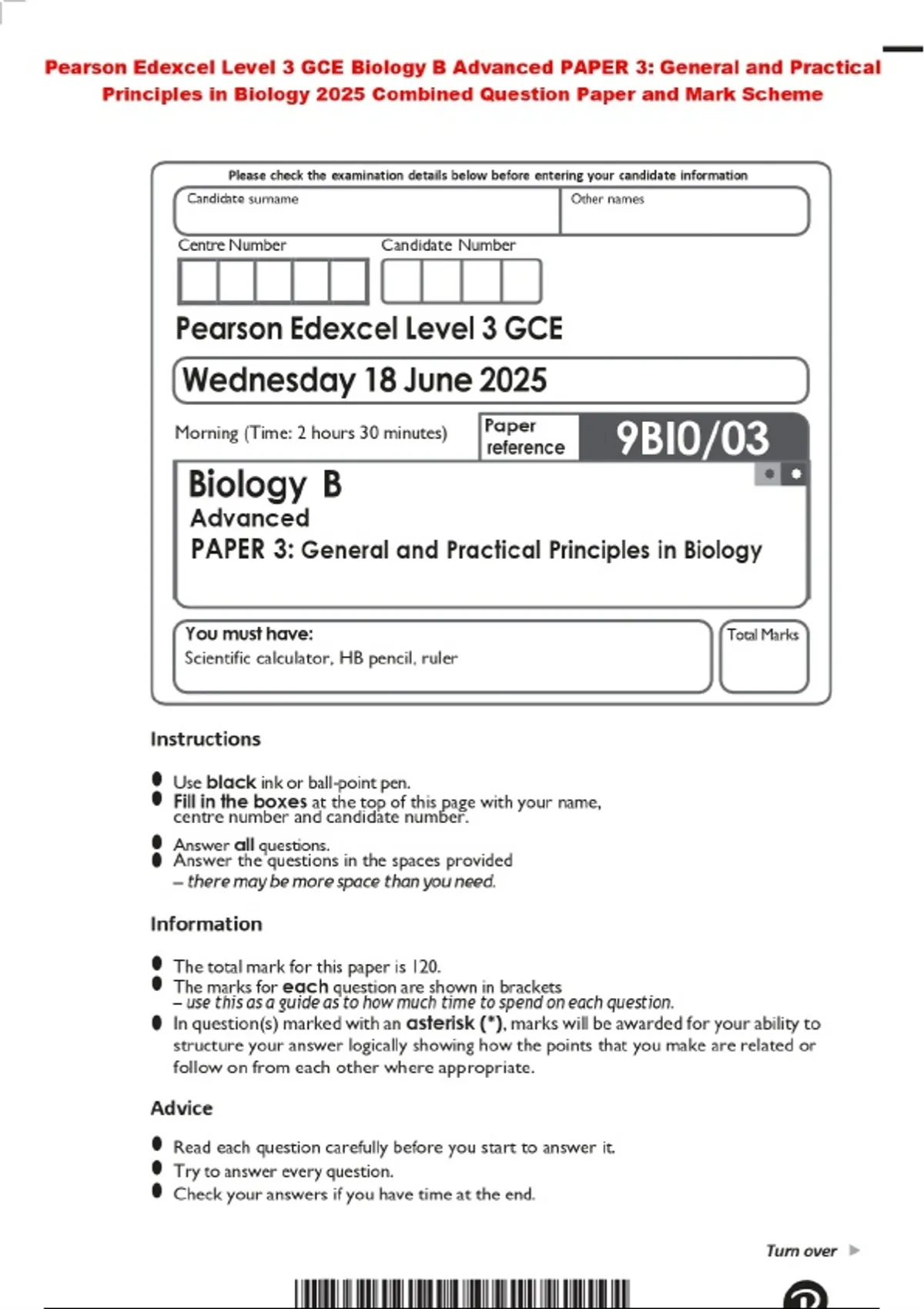 Pearson Edexcel Level 3 GCE Biology B Advanced PAPER 3: General and Practical Principles in Biology 2025 Combined Question Paper and Mark Scheme
