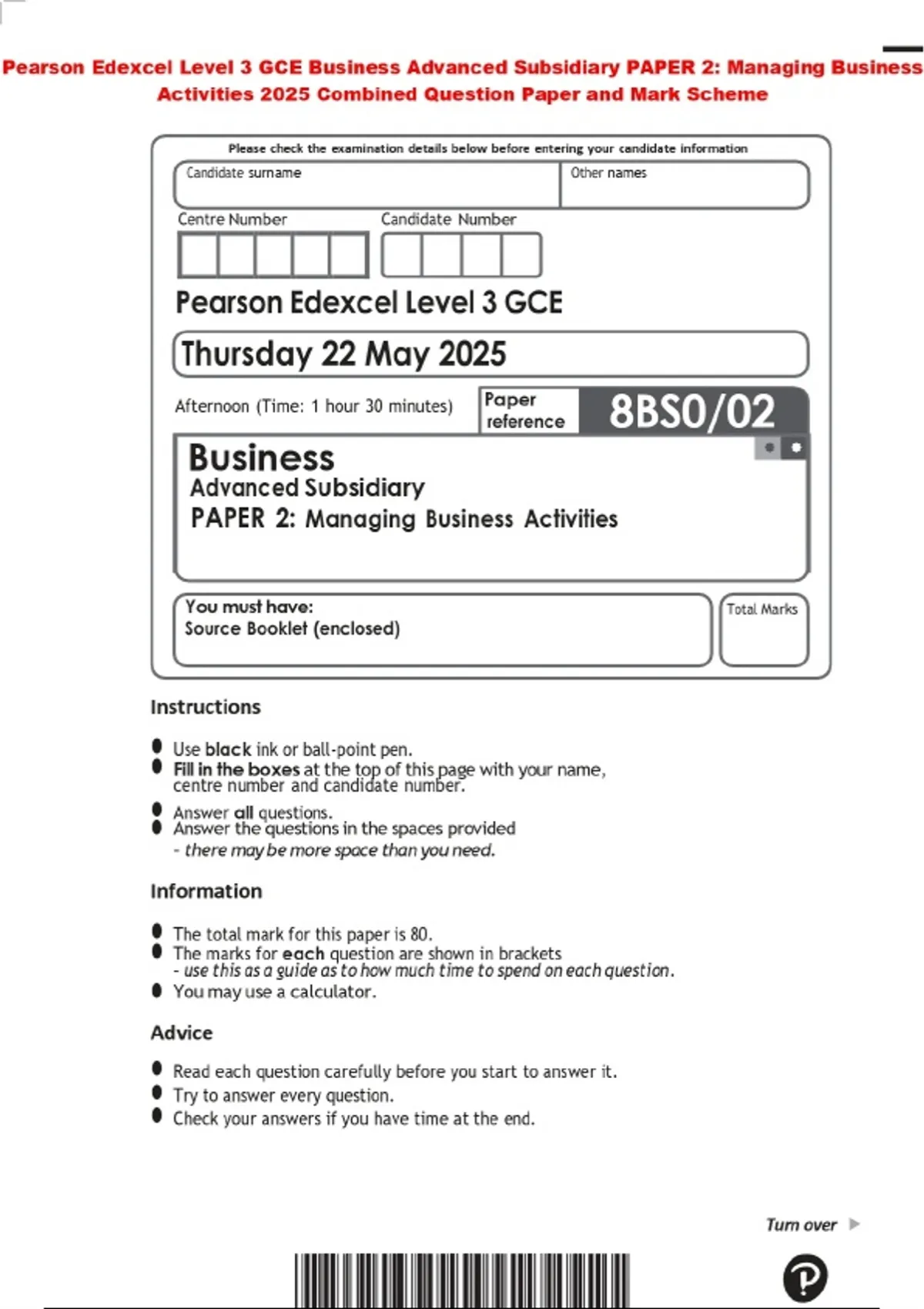 Pearson Edexcel Level 3 GCE Business Advanced Subsidiary PAPER 2: Managing Business Activities 2025 Combined Question Paper and Mark Scheme