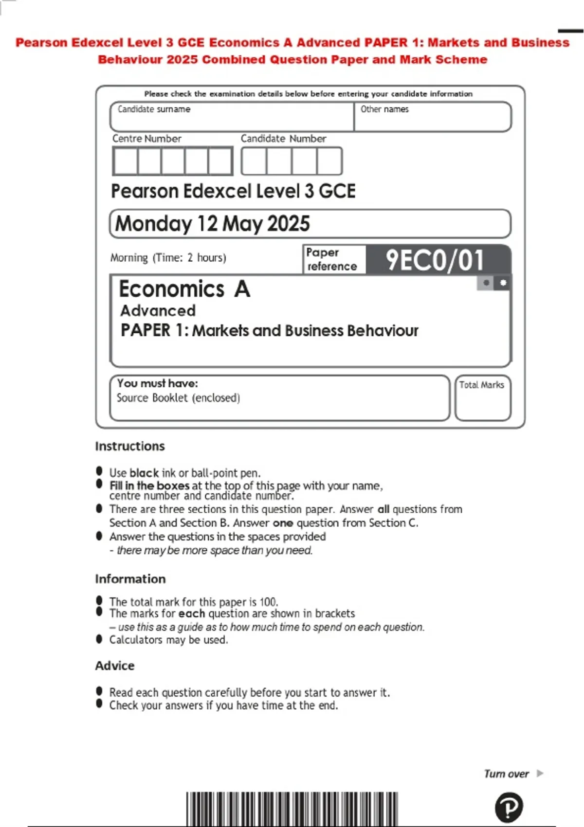 Pearson Edexcel Level 3 GCE Economics A Advanced PAPER 1: Markets and Business Behaviour 2025 Combined Question Paper and Mark Scheme