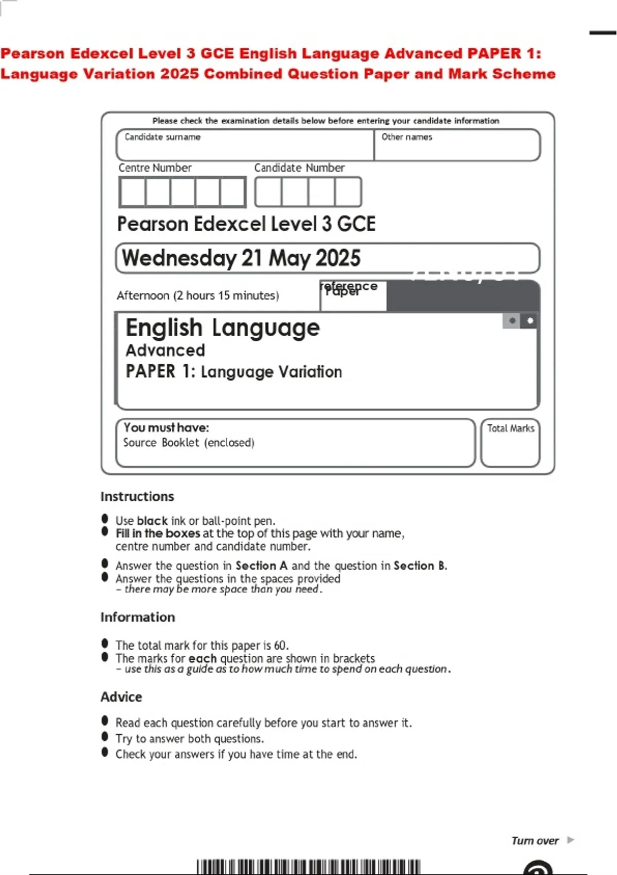 Pearson Edexcel Level 3 GCE English Language Advanced PAPER 1: Language Variation 2025 Combined Question Paper and Mark Scheme