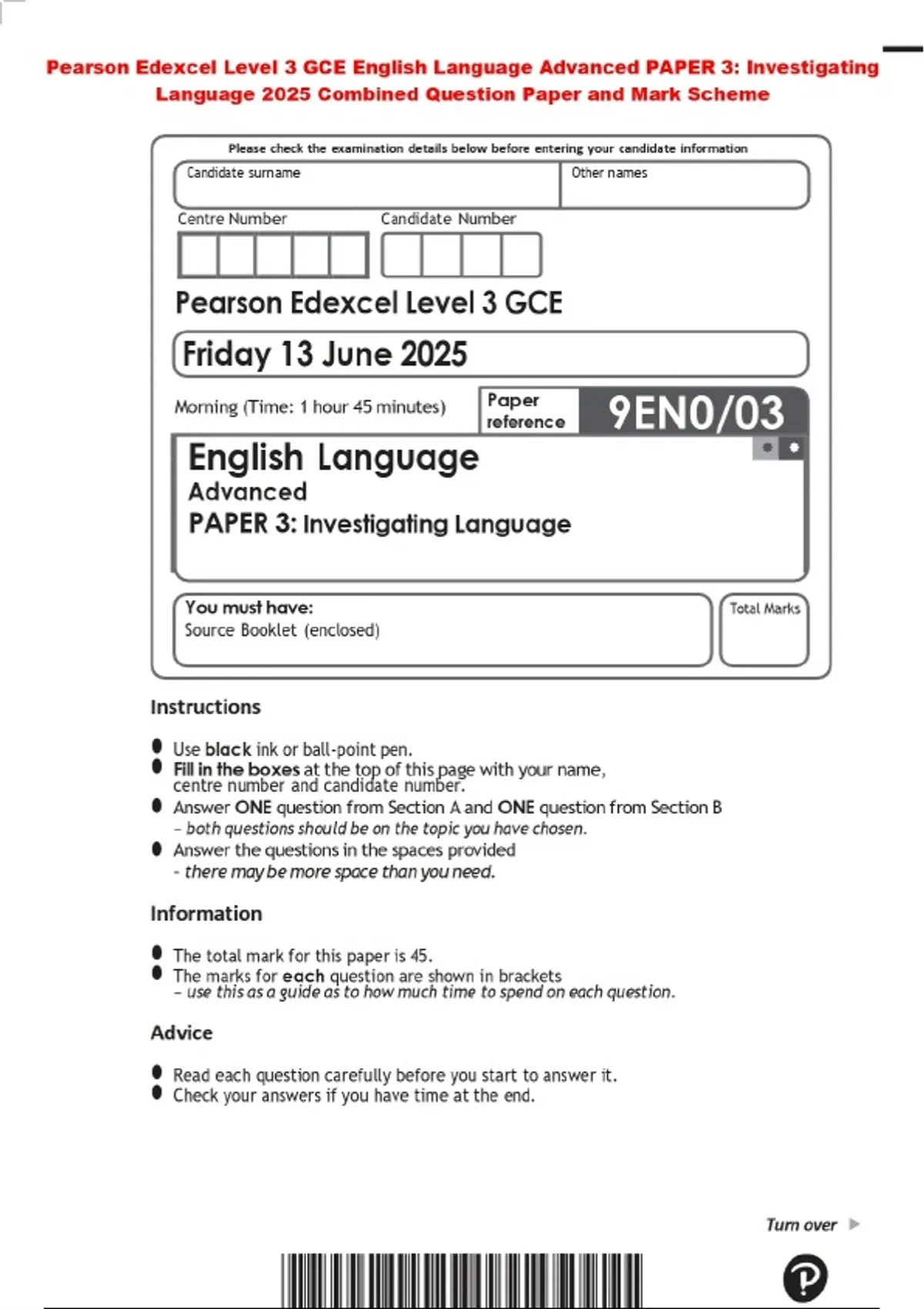 Pearson Edexcel Level 3 GCE English Language Advanced PAPER 3: Investigating Language 2025 Combined Question Paper and Mark Scheme