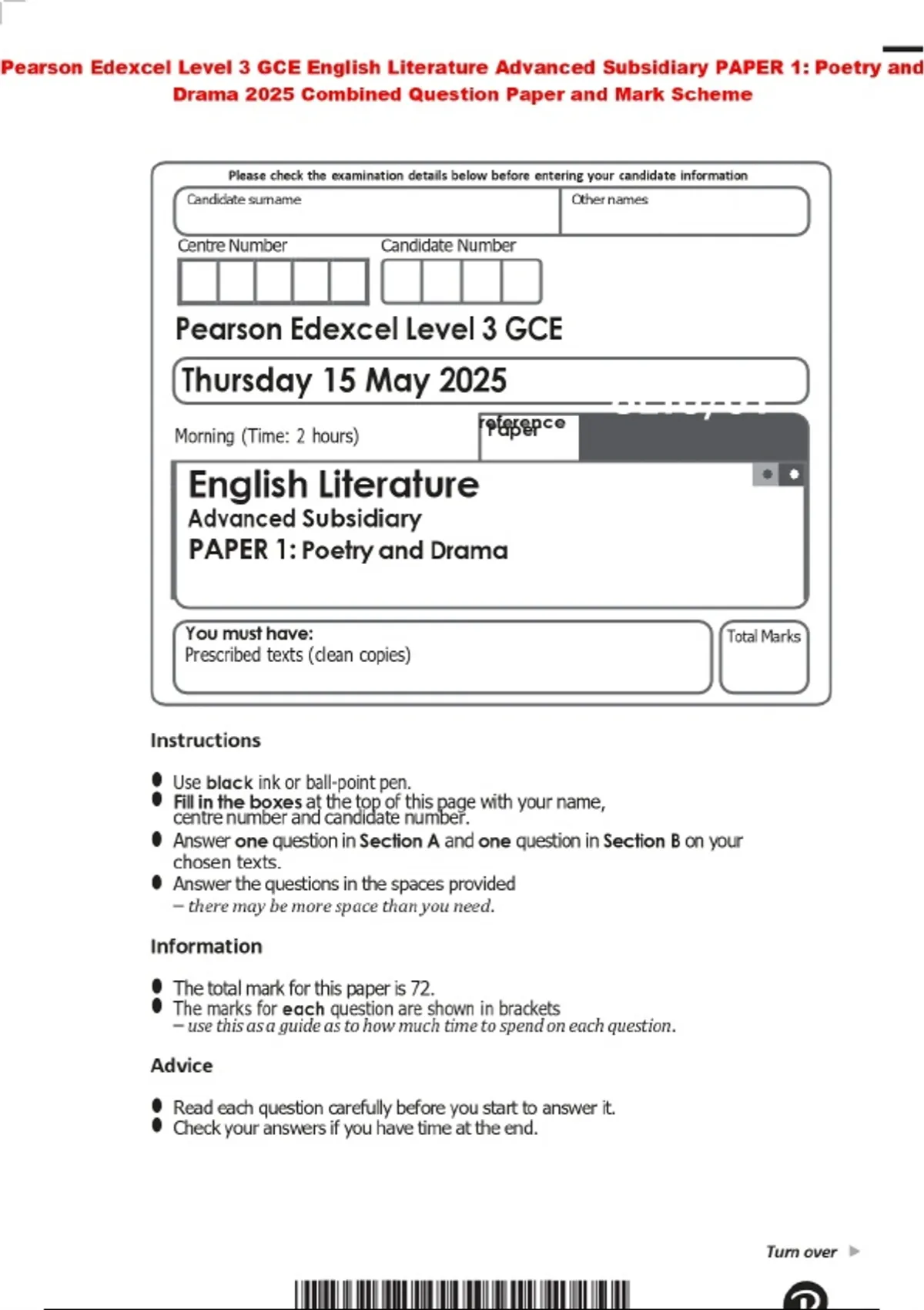 Pearson Edexcel Level 3 GCE English Literature Advanced Subsidiary PAPER 1: Poetry and Drama 2025 Combined Question Paper and Mark Scheme