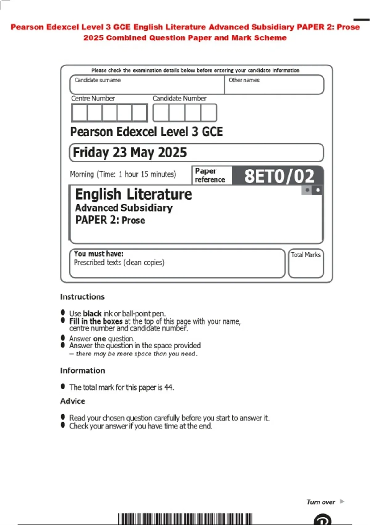 Pearson Edexcel Level 3 GCE English Literature Advanced Subsidiary PAPER 2: Prose 2025 Combined Question Paper and Mark Scheme