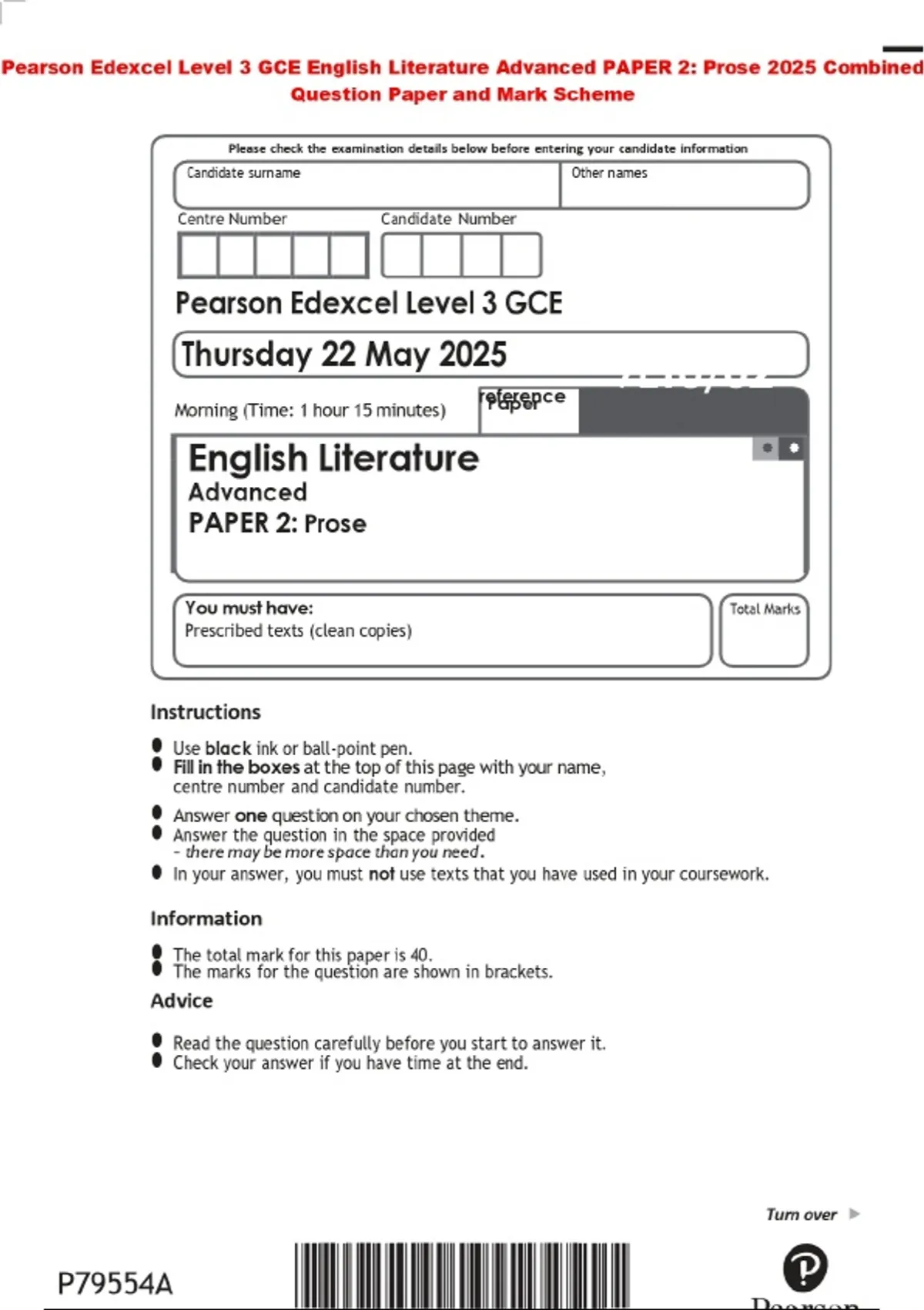 Pearson Edexcel Level 3 GCE English Literature Advanced PAPER 2: Prose 2025 Combined Question Paper and Mark Scheme
