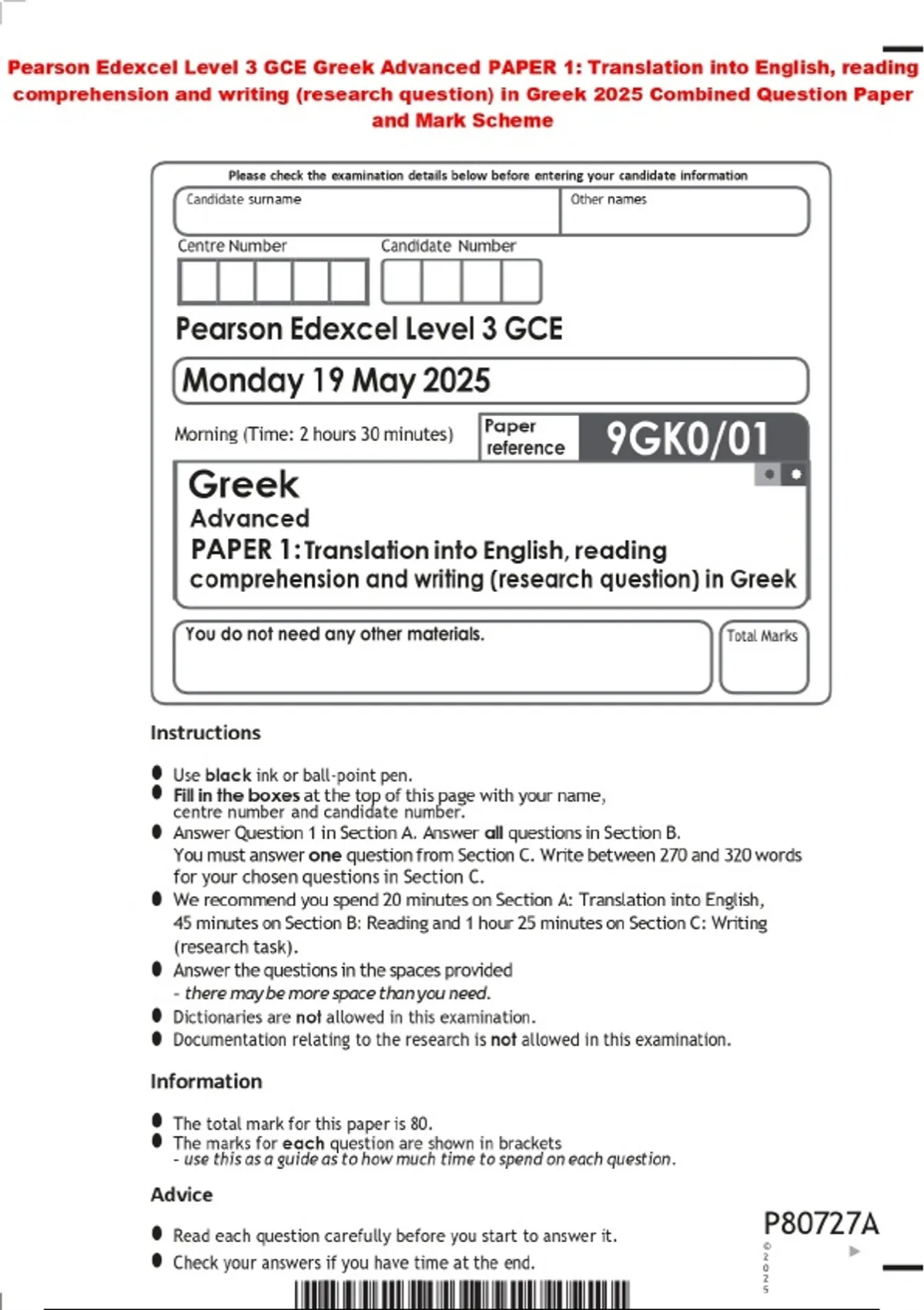 Pearson Edexcel Level 3 GCE Greek Advanced PAPER 1: Translation into English, reading comprehension and writing (research question) in Greek 2025 Combined Question Paper and Mark Scheme