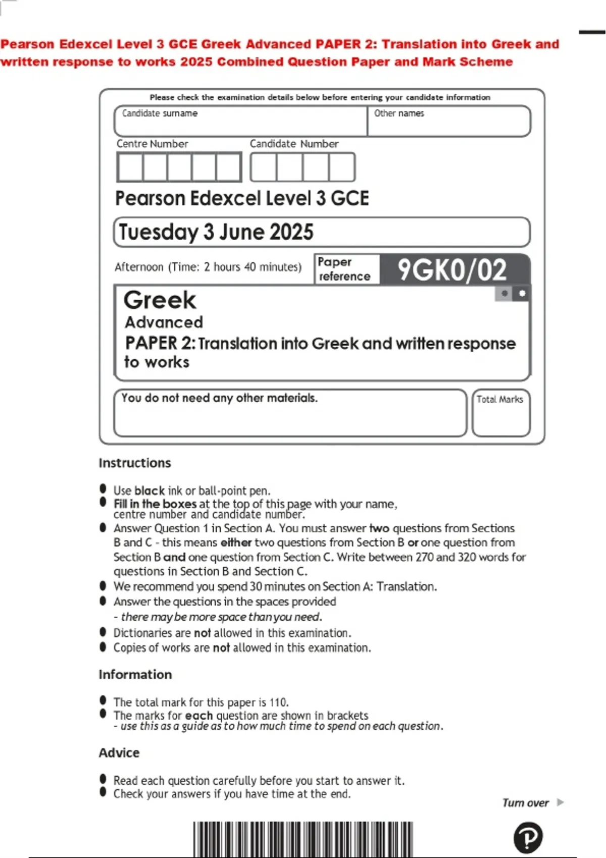 Pearson Edexcel Level 3 GCE Greek Advanced PAPER 2: Translation into Greek and written response to works 2025 Combined Question Paper and Mark Scheme