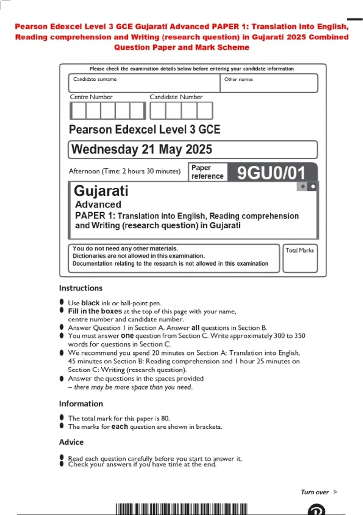 Pearson Edexcel Level 3 GCE Gujarati Advanced PAPER 1: Translation into English, Reading comprehension and Writing (research question) in Gujarati 2025 Combined Question Paper and Mark Scheme