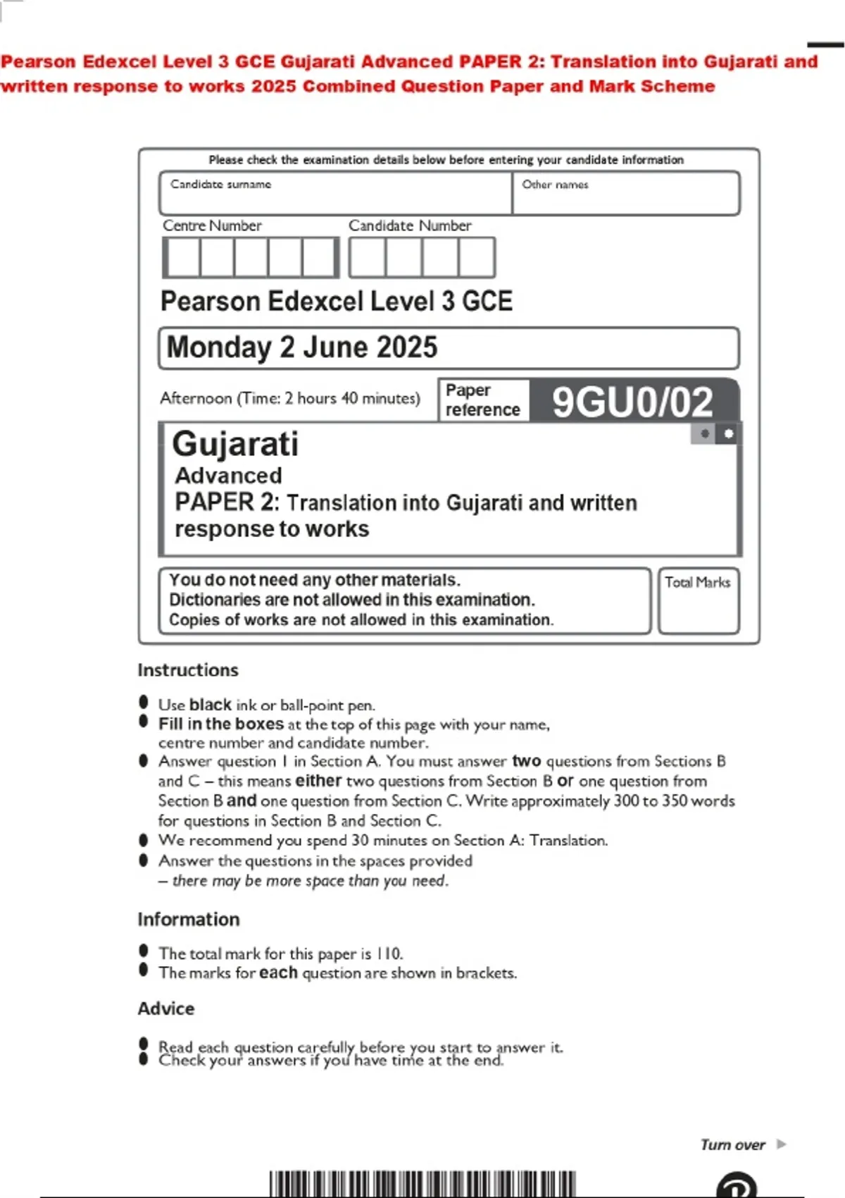 Pearson Edexcel Level 3 GCE Gujarati Advanced PAPER 2: Translation into Gujarati and written response to works 2025 Combined Question Paper and Mark Scheme