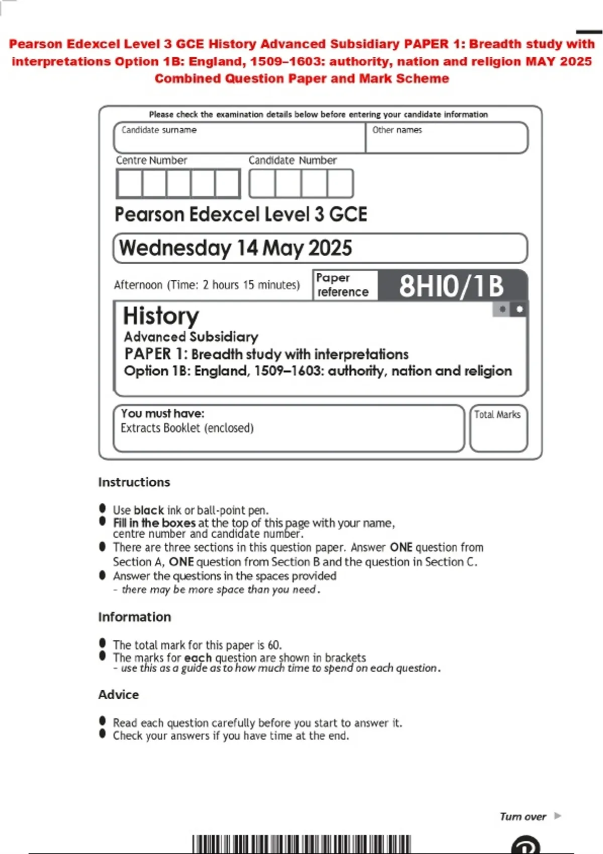 Pearson Edexcel Level 3 GCE History Advanced Subsidiary PAPER 1: Breadth study with interpretations Option 1B: England, 1509–1603: authority, nation and religion MAY 2025 Combined Question Paper and Mark Scheme