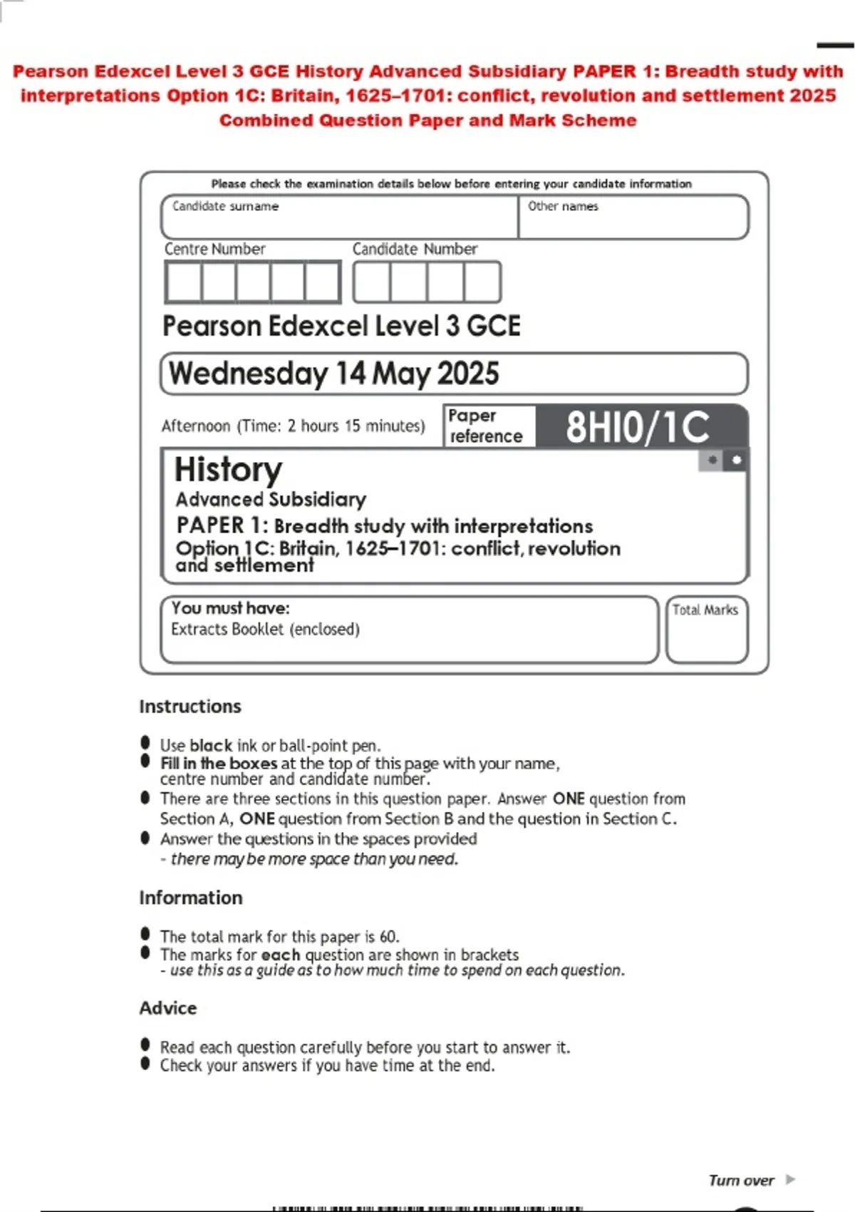Pearson Edexcel Level 3 GCE History Advanced Subsidiary PAPER 1: Breadth study with interpretations Option 1C: Britain, 1625–1701: conflict, revolution and settlement 2025 Combined Question Paper and Mark Scheme