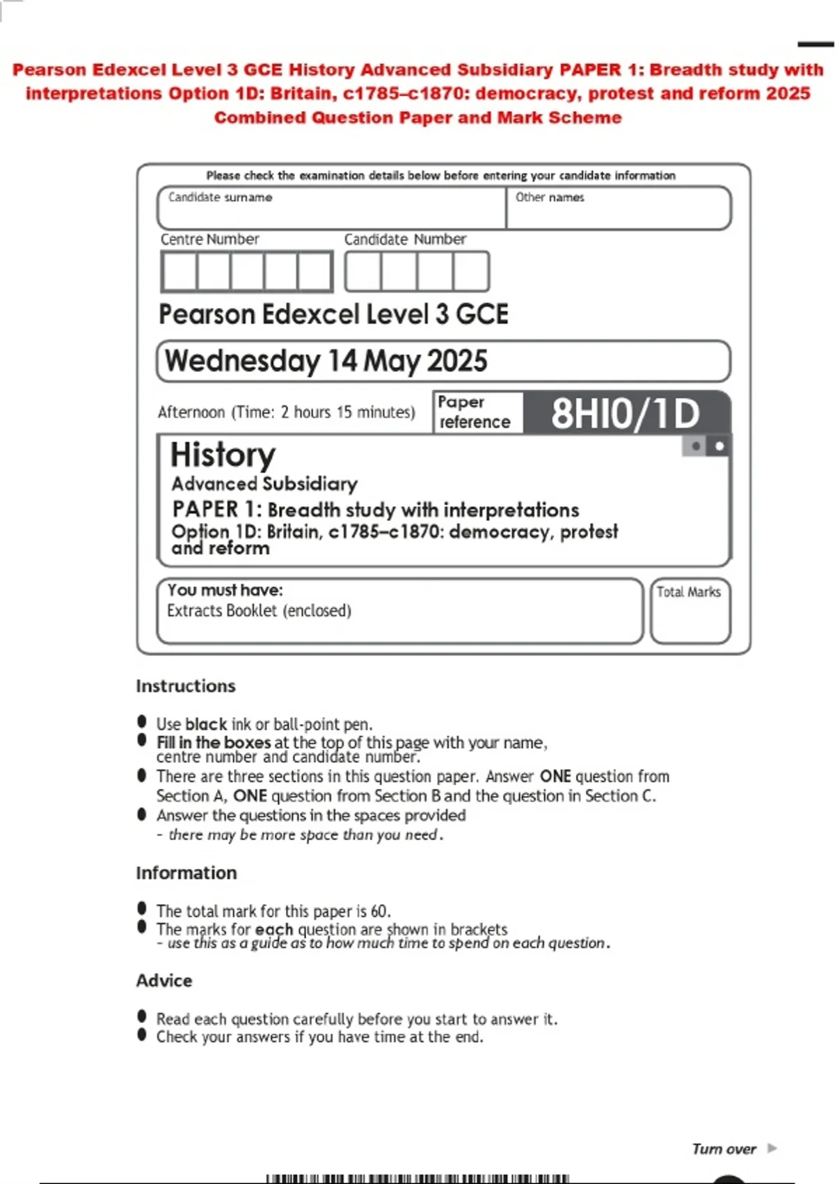 Pearson Edexcel Level 3 GCE History Advanced Subsidiary PAPER 1: Breadth study with interpretations Option 1D: Britain, c1785–c1870: democracy, protest and reform 2025 Combined Question Paper and Mark Scheme