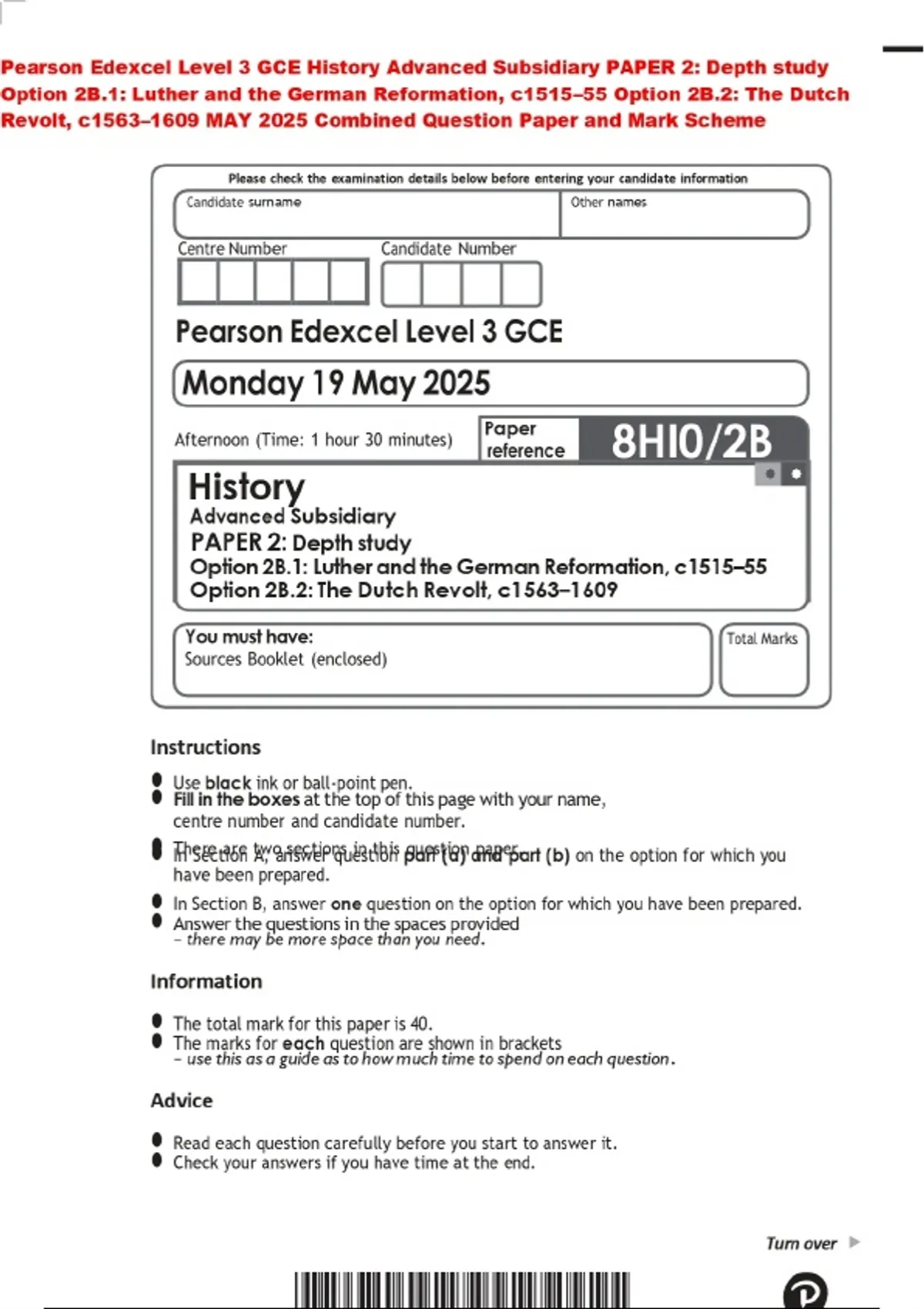 Pearson Edexcel Level 3 GCE History Advanced Subsidiary PAPER 2: Depth study Option 2B.1: Luther and the German Reformation, c1515–55 Option 2B.2: The Dutch Revolt, c1563–1609 MAY 2025 Combined Question Paper and Mark Scheme