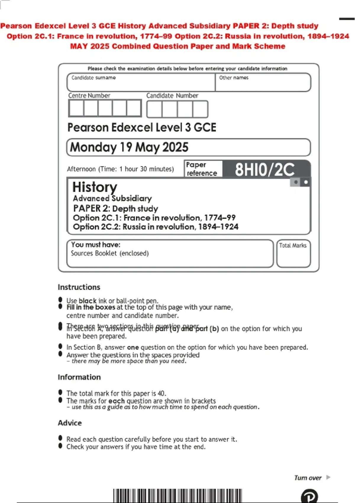 Pearson Edexcel Level 3 GCE History Advanced Subsidiary PAPER 2: Depth study Option 2C.1: France in revolution, 1774–99 Option 2C.2: Russia in revolution, 1894–1924 MAY 2025 Combined Question Paper and Mark Scheme