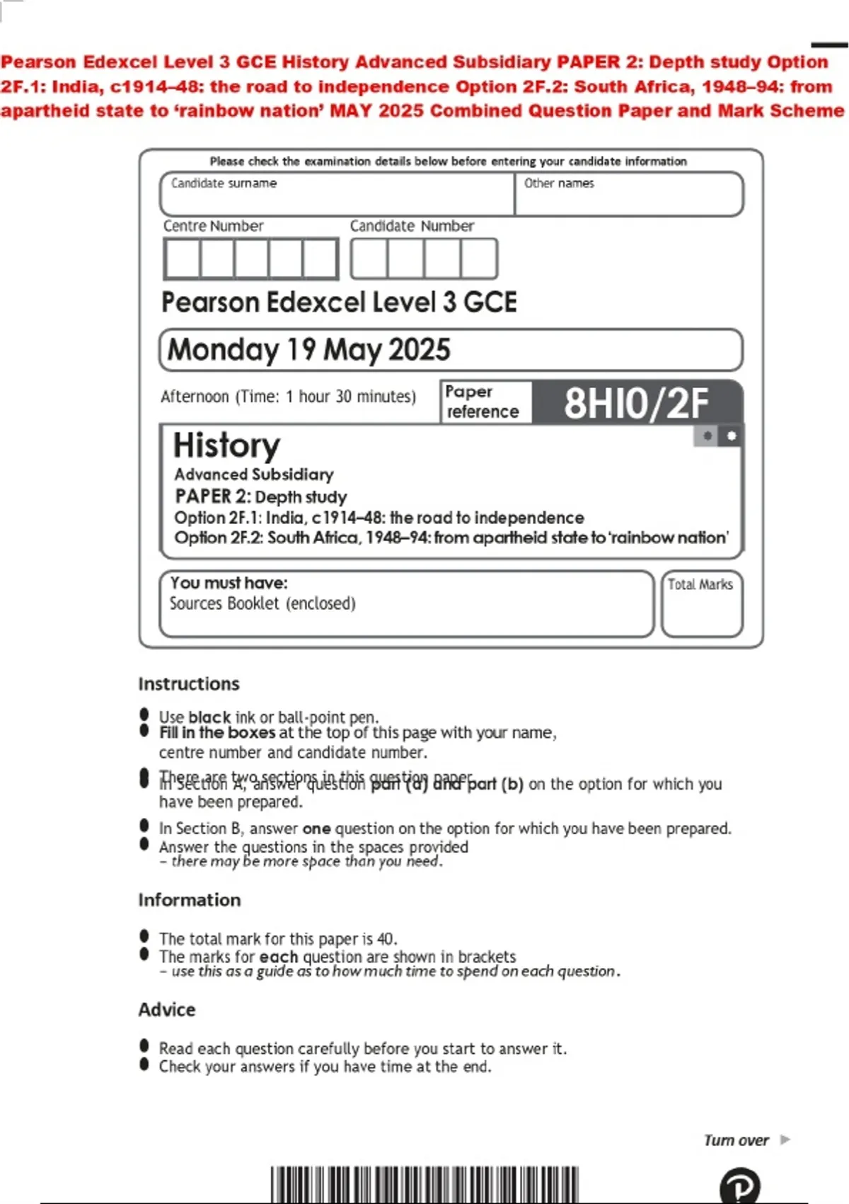Pearson Edexcel Level 3 GCE History Advanced Subsidiary PAPER 2: Depth study Option 2F.1: India, c1914–48: the road to independence Option 2F.2: South Africa, 1948–94: from apartheid state to ‘rainbow nation’ MAY 2025 Combined Question Paper and Mark Sc