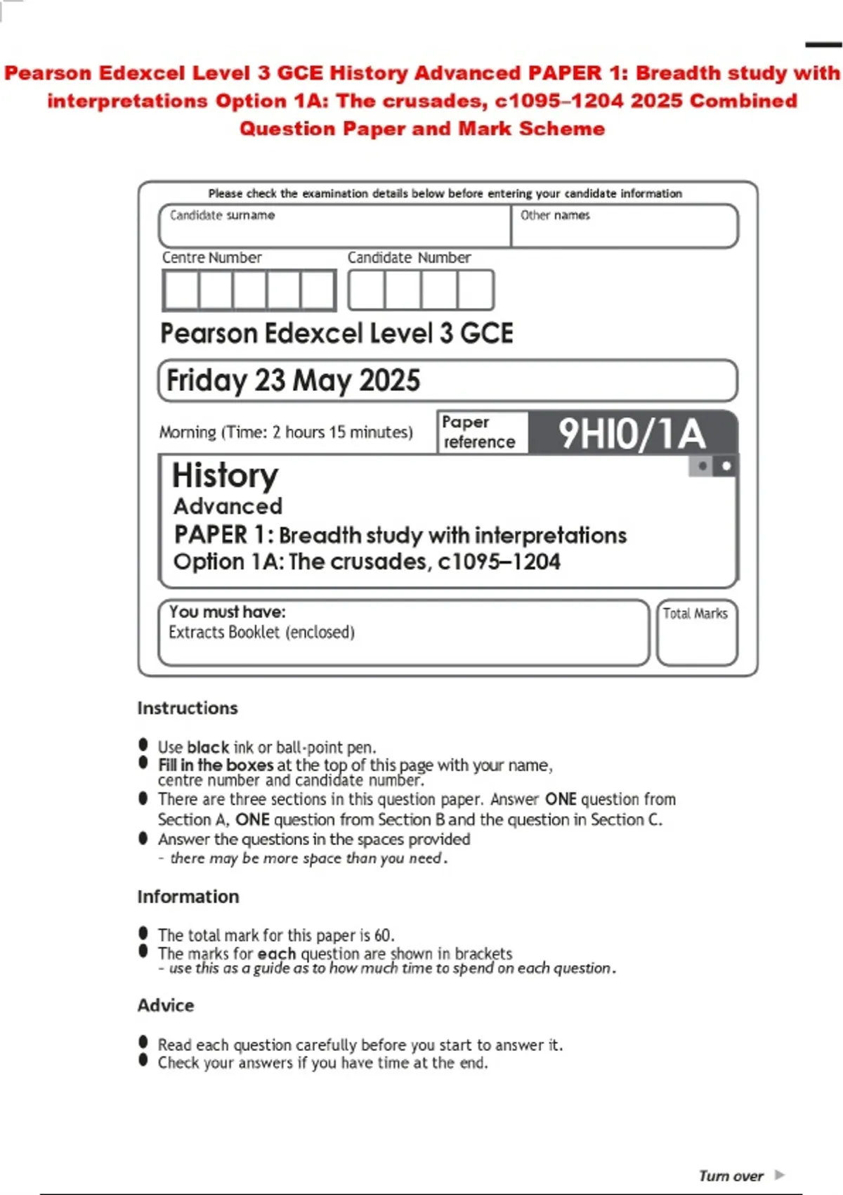 Pearson Edexcel Level 3 GCE History Advanced PAPER 1: Breadth study with interpretations Option 1A: The crusades, c1095– Combined Question Paper and Mark Scheme