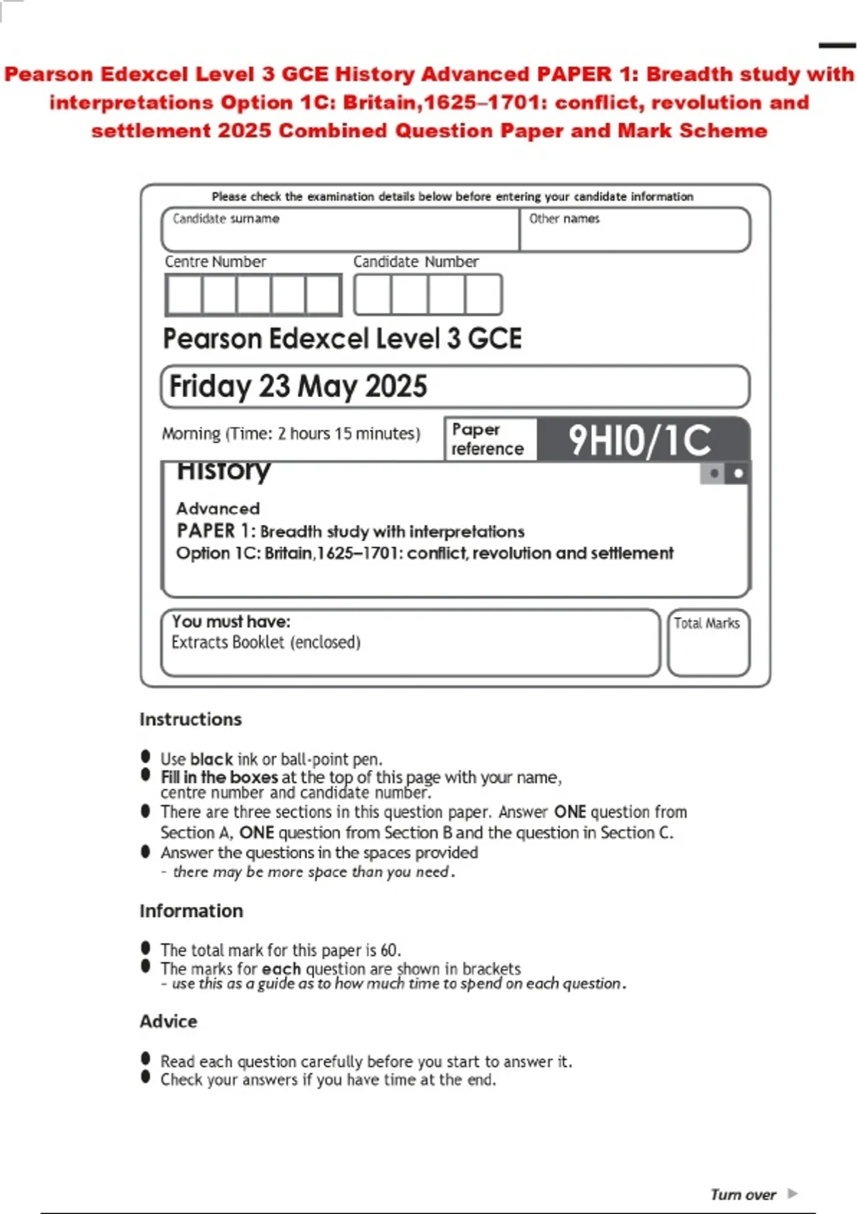 Pearson Edexcel Level 3 GCE History Advanced PAPER 1: Breadth study with interpretations Option 1C: Britain,1625–1701: conflict, revolution and settlement 2025 Combined Question Paper and Mark Scheme