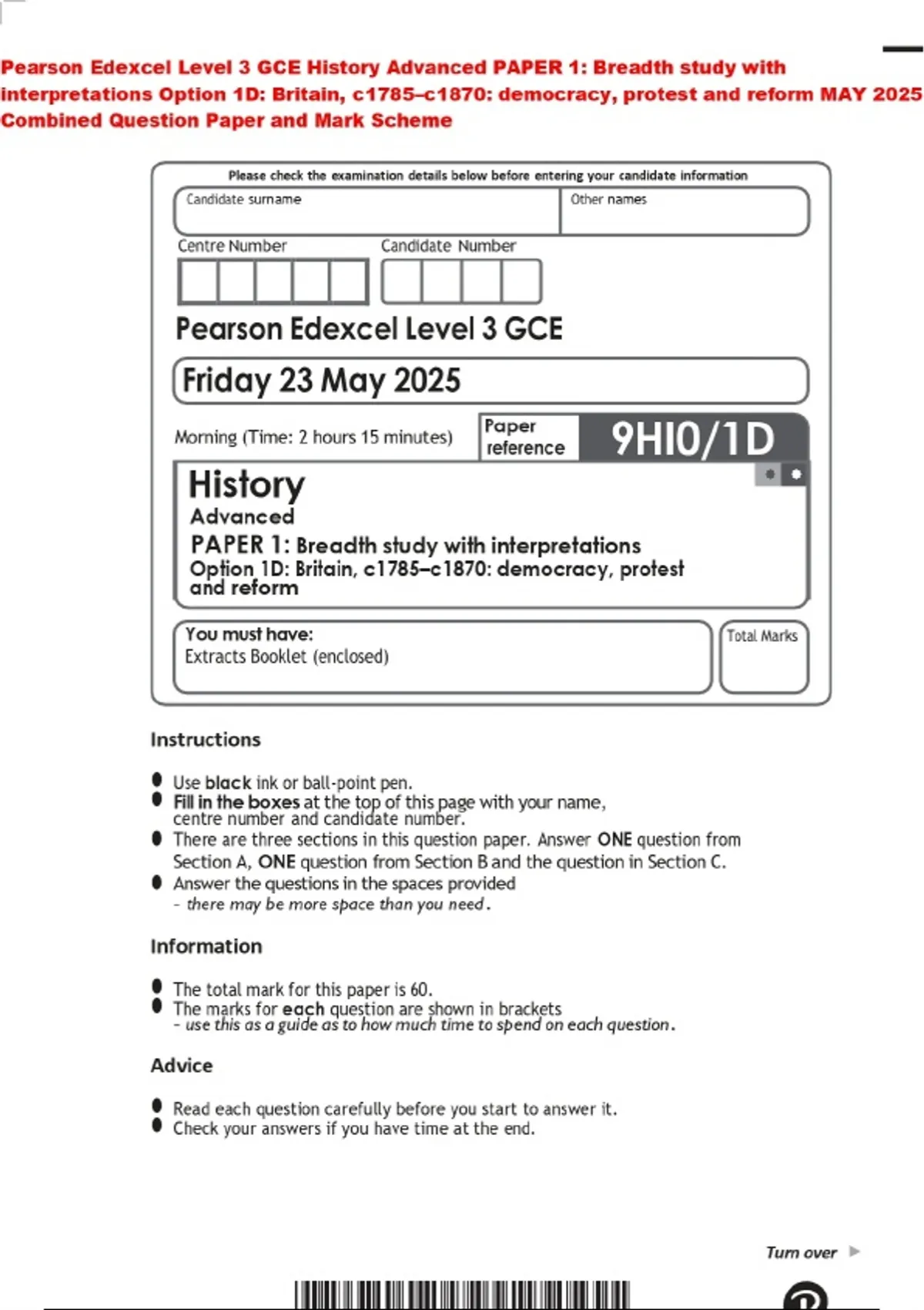 Pearson Edexcel Level 3 GCE History Advanced PAPER 1: Breadth study with interpretations Option 1D: Britain, c1785–c1870: democracy, protest and reform MAY 2025 Combined Question Paper and Mark Scheme