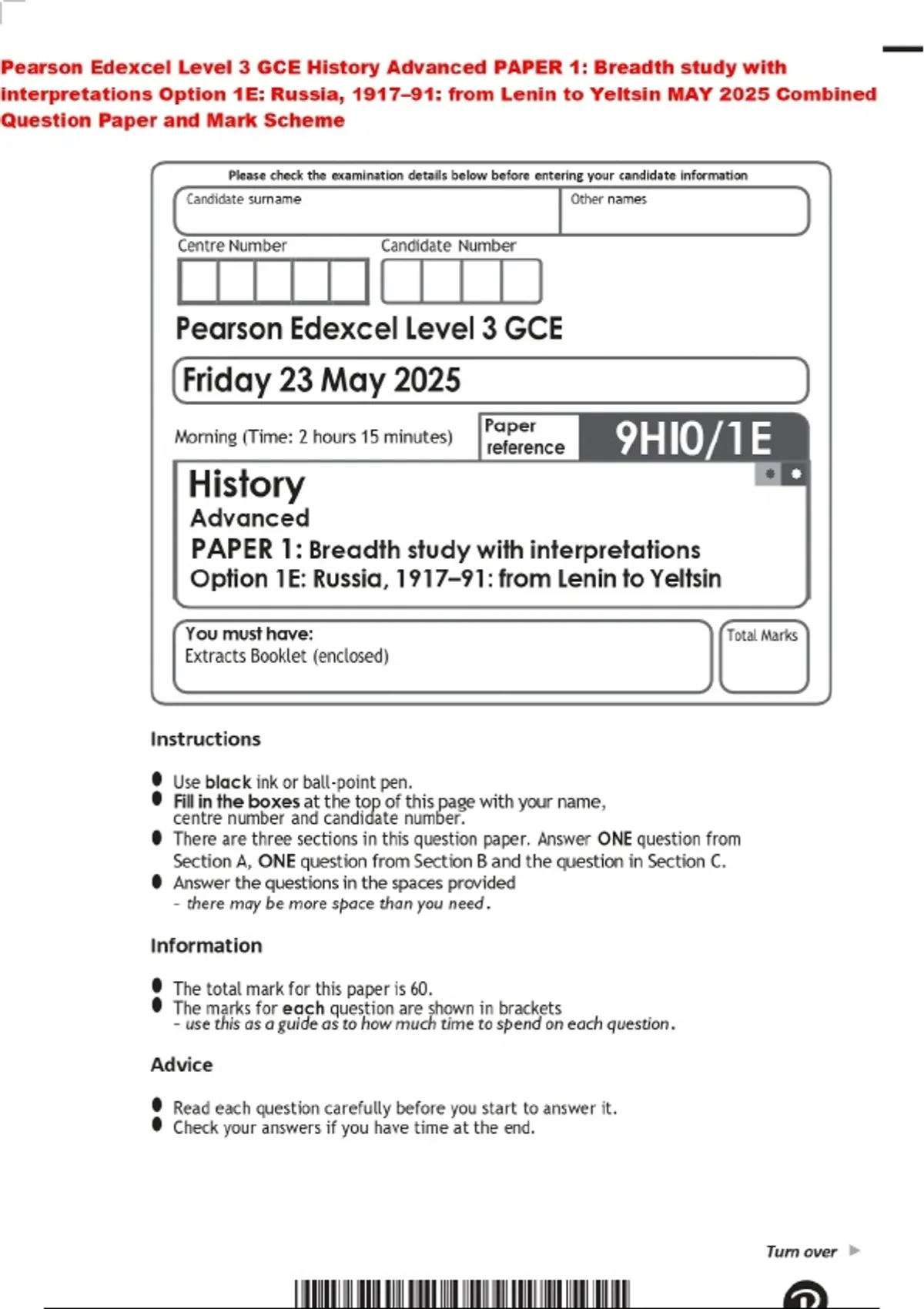Pearson Edexcel Level 3 GCE History Advanced PAPER 1: Breadth study with interpretations Option 1E: Russia, 1917–91: from Lenin to Yeltsin MAY 2025 Combined Question Paper and Mark Scheme