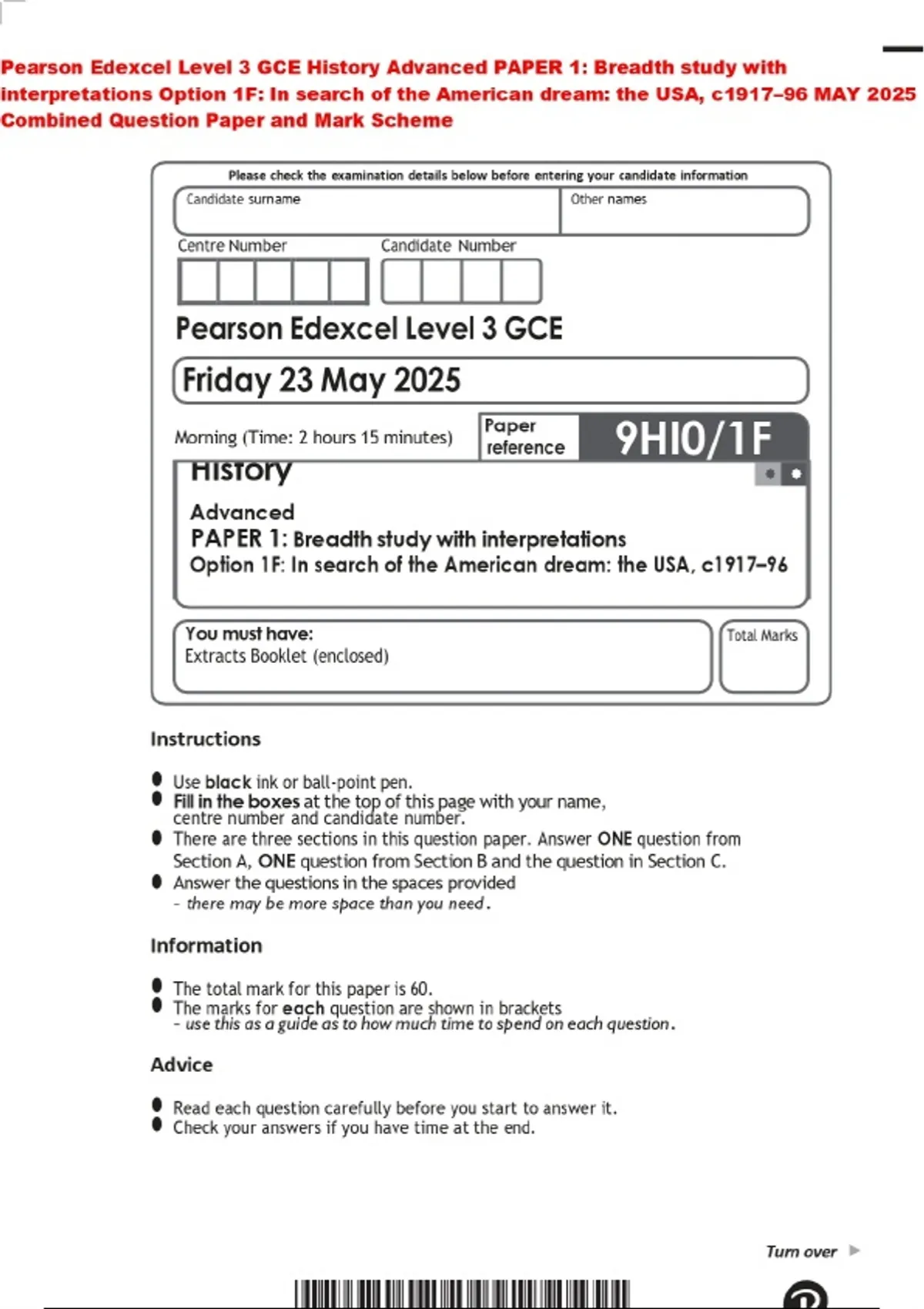 Pearson Edexcel Level 3 GCE History Advanced PAPER 1: Breadth study with interpretations Option 1F: In search of the American dream: the USA, c1917–96 MAY 2025 Combined Question Paper and Mark Scheme
